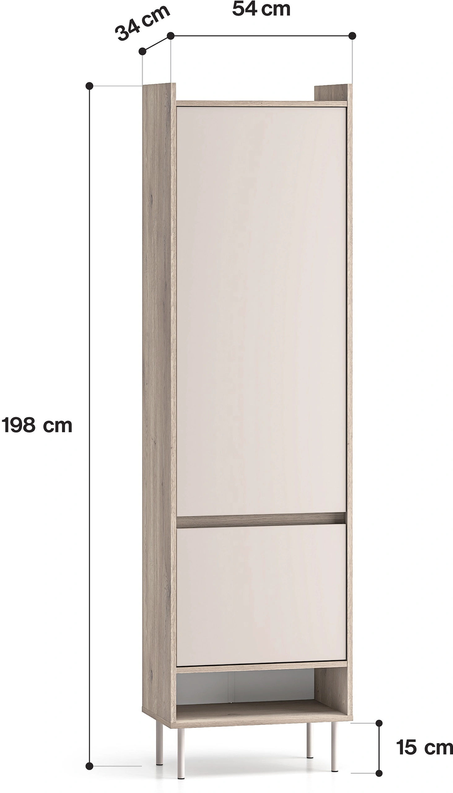 Szafa do przedpokoju z drążkiem VOCO w eleganckim odcieniu kaszmiru to połączenie nowoczesnego designu i praktycznej funkcjonalności. Smukła forma, wysuwany wieszak i kompaktowe wymiary czynią ją idealnym wyborem do mniejszych przestrzeni, zapewniając wygodne przechowywanie codziennej garderoby.