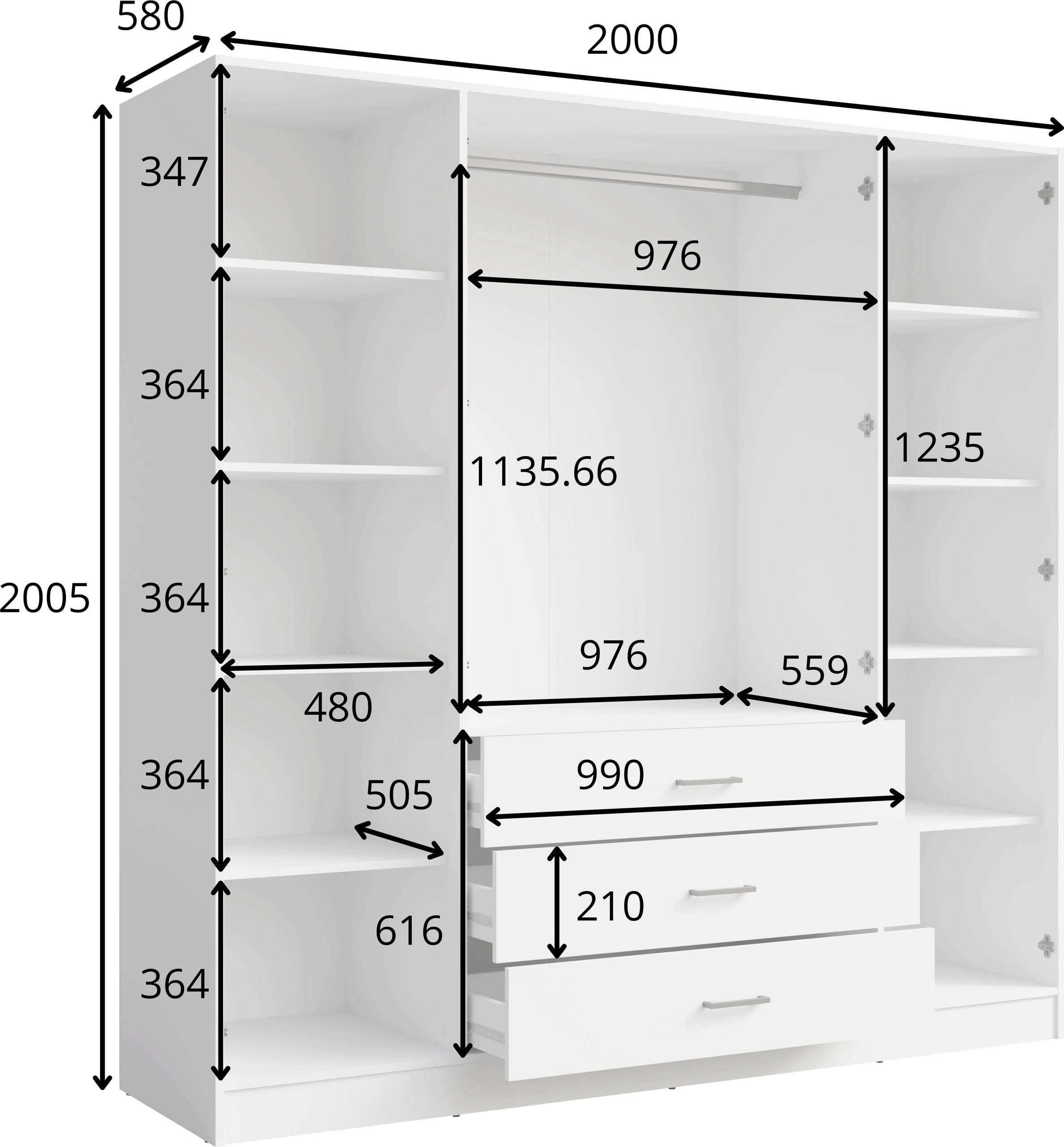 - Wnętrze: 10 półek, 3 szuflady, 1 drążek na wieszaki