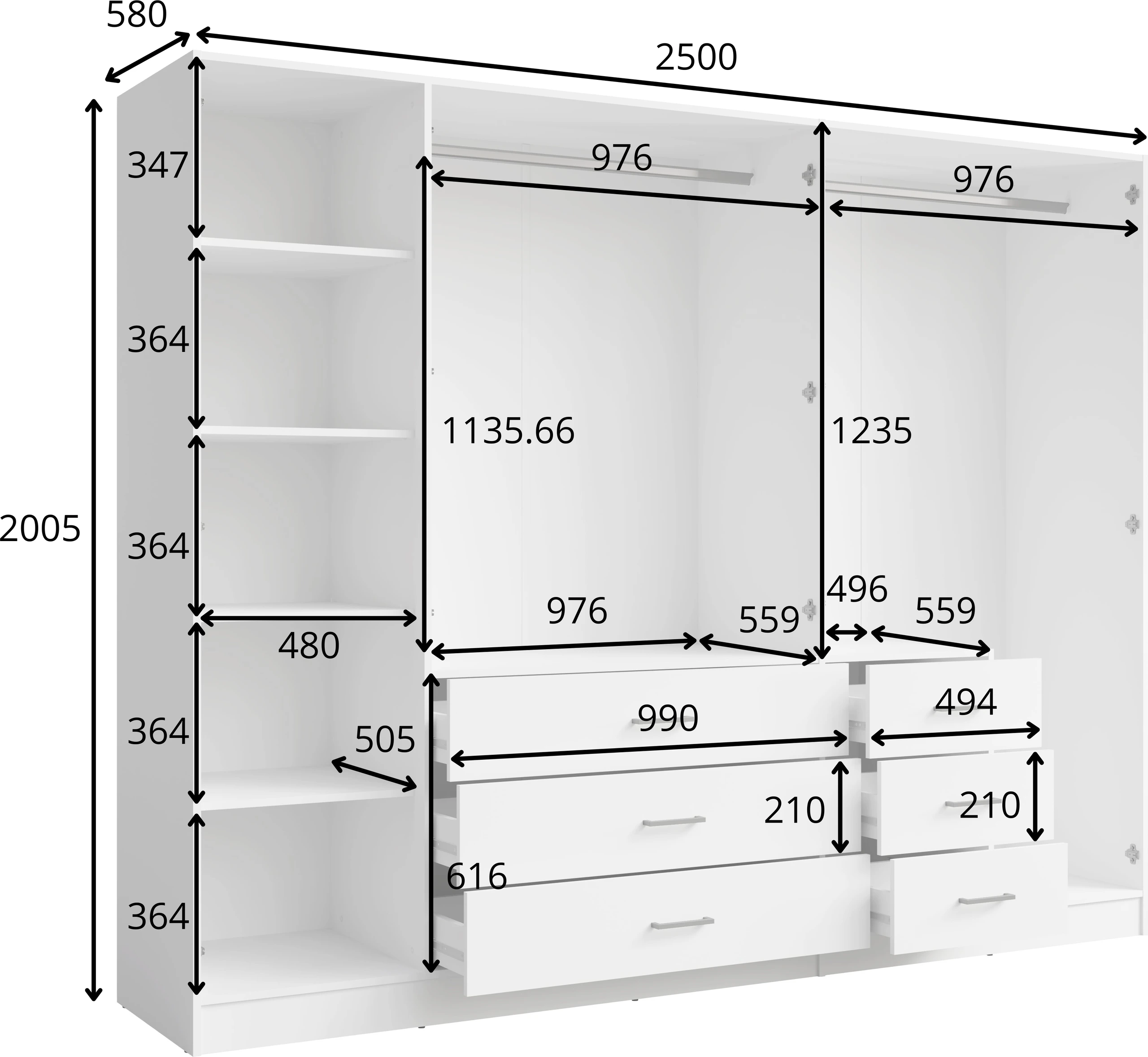 - Wymiary: szerokość 250 cm, wysokość 200,5 cm, głębokość 58 cm