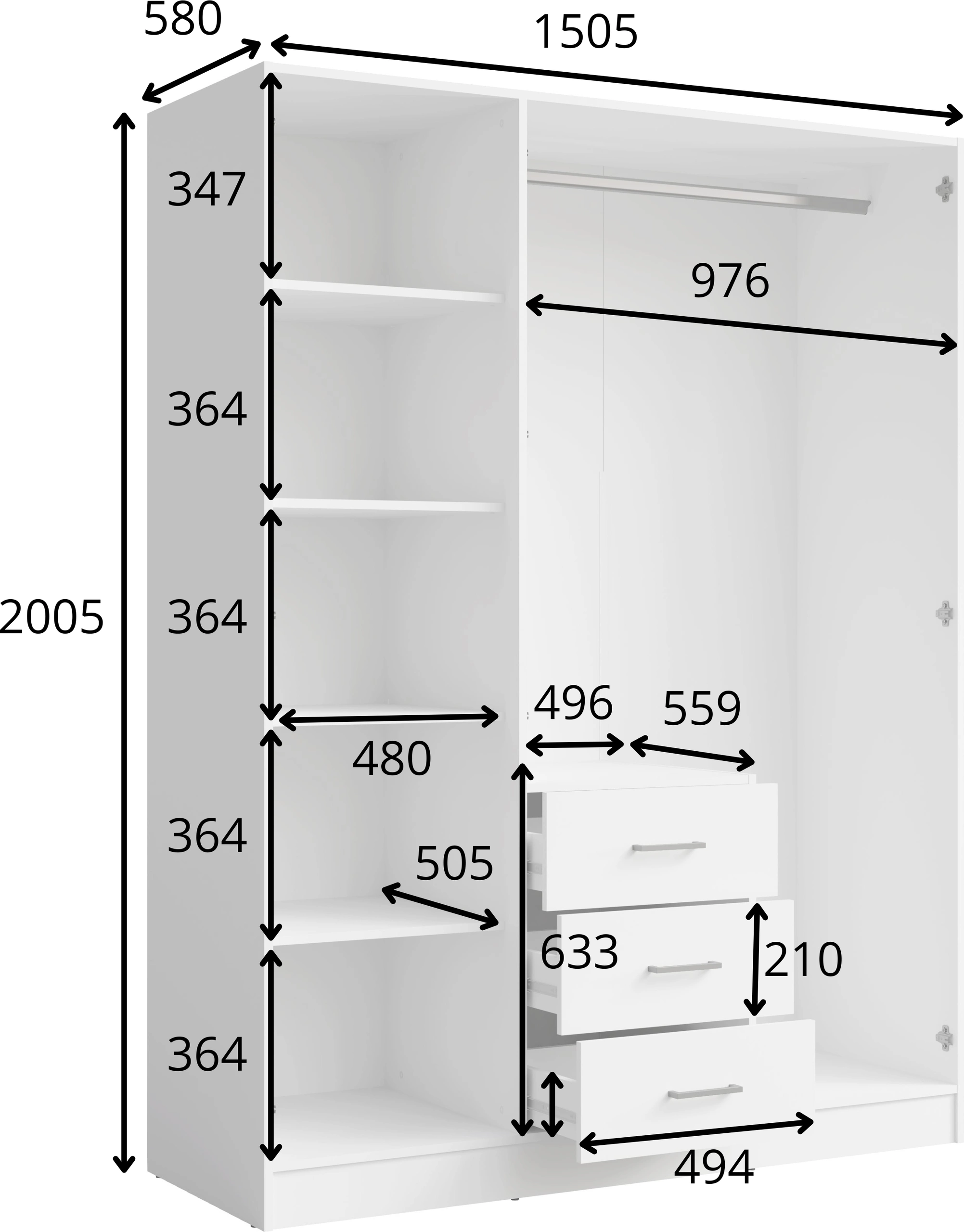 - Wymiary: szerokość 150 cm, wysokość 200,5 cm, głębokość 58 cm
