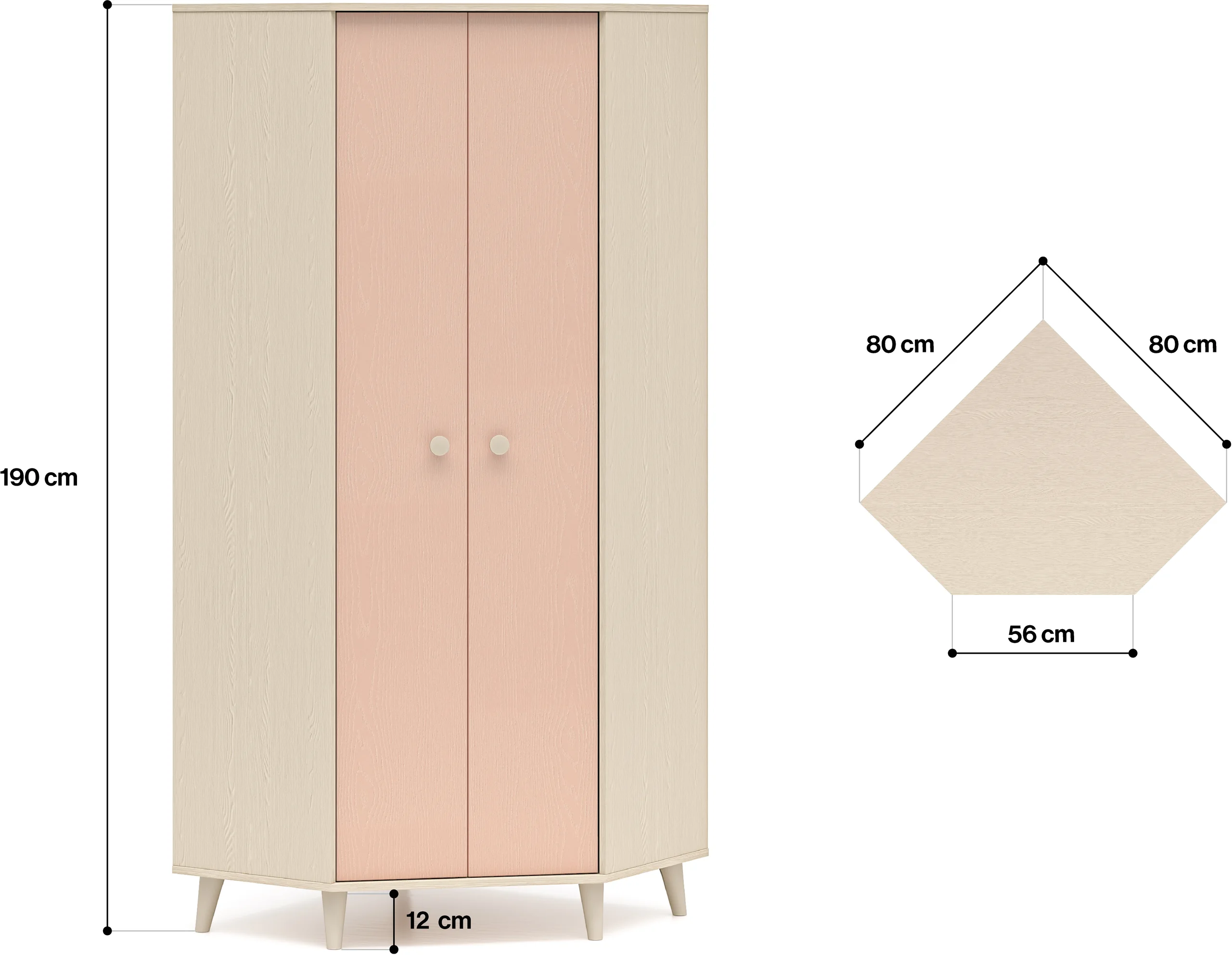 Szafa narożna MERLO to idealne rozwiązanie do pokoju dziecięcego, młodzieżowego lub nowoczesnej sypialni, w której liczy się każdy centymetr przestrzeni. Połączenie koloru piasek pustyni z modnym odcieniem millennial pink nadaje wnętrzu lekkości i subtelnej elegancji, a narożna forma pozwala maksymalnie wykorzystać trudne do zagospodarowania miejsca.