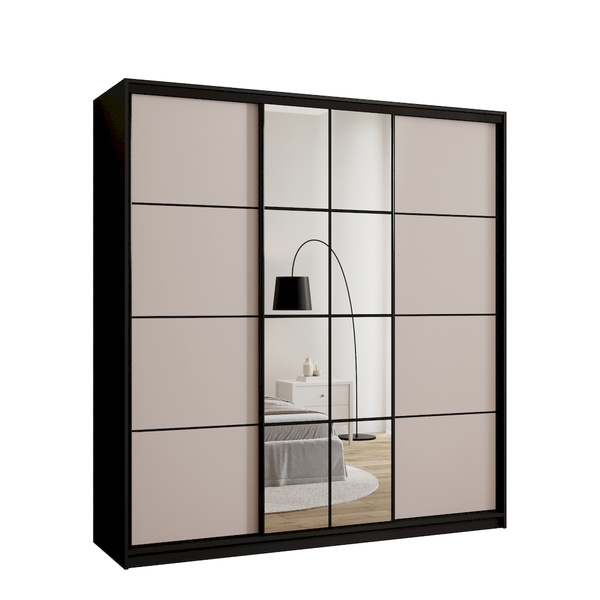 Poznaj wyjątkową szafę przesuwną z lustrem EDGE, która łączy w sobie nowoczesny design, praktyczne rozwiązania i wysoką jakość wykonania. Ten elegancki mebel to doskonałe uzupełnienie każdej sypialni, garderoby lub przedpokoju. Drzwi przesuwne poruszają się na wytrzymałym stalowym systemie w czarnym kolorze, który zapewnia płynność i trwałość użytkowania. Całość dopełniają czarne stalowe uchwyty, podkreślające nowoczesny charakter mebla.