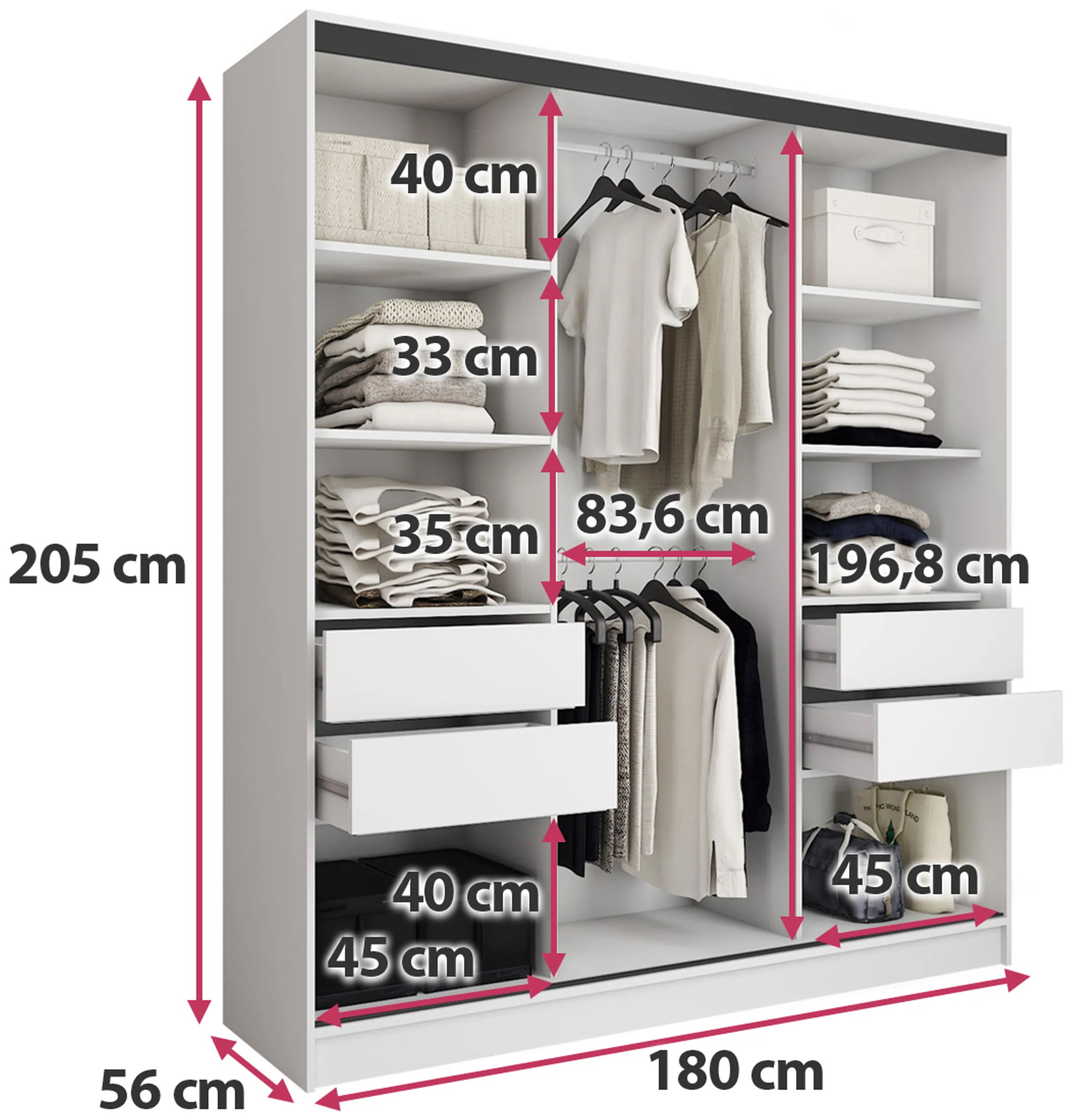 W szafie znajdują się dwa aluminiowe drążki na wieszaki, które umożliwiają przechowywanie odzieży w sposób, który zapobiega jej gnieceniu. Idealne miejsce na płaszcze, sukienki czy garnitury.