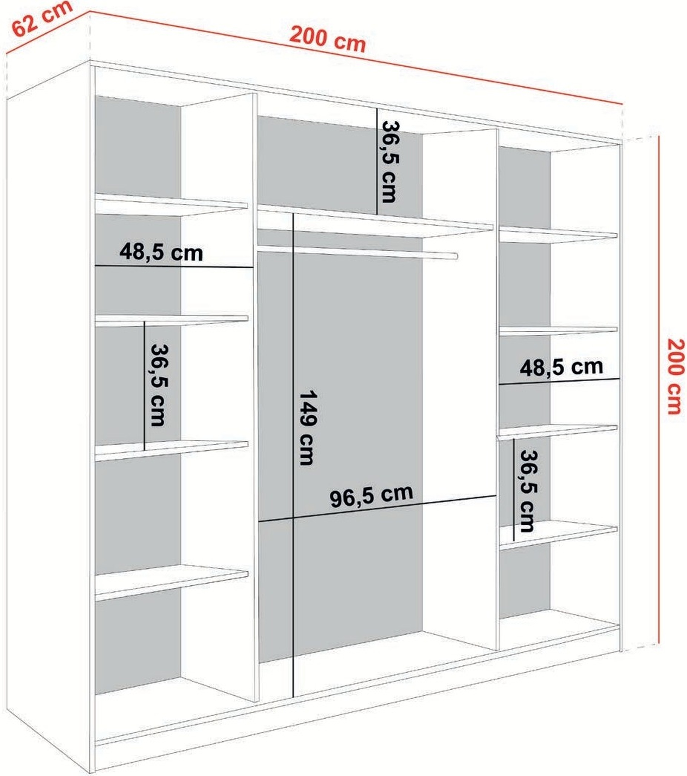 - Wymiary: szerokość 200 cm, wysokość 200 cm, głębokość 62 cm