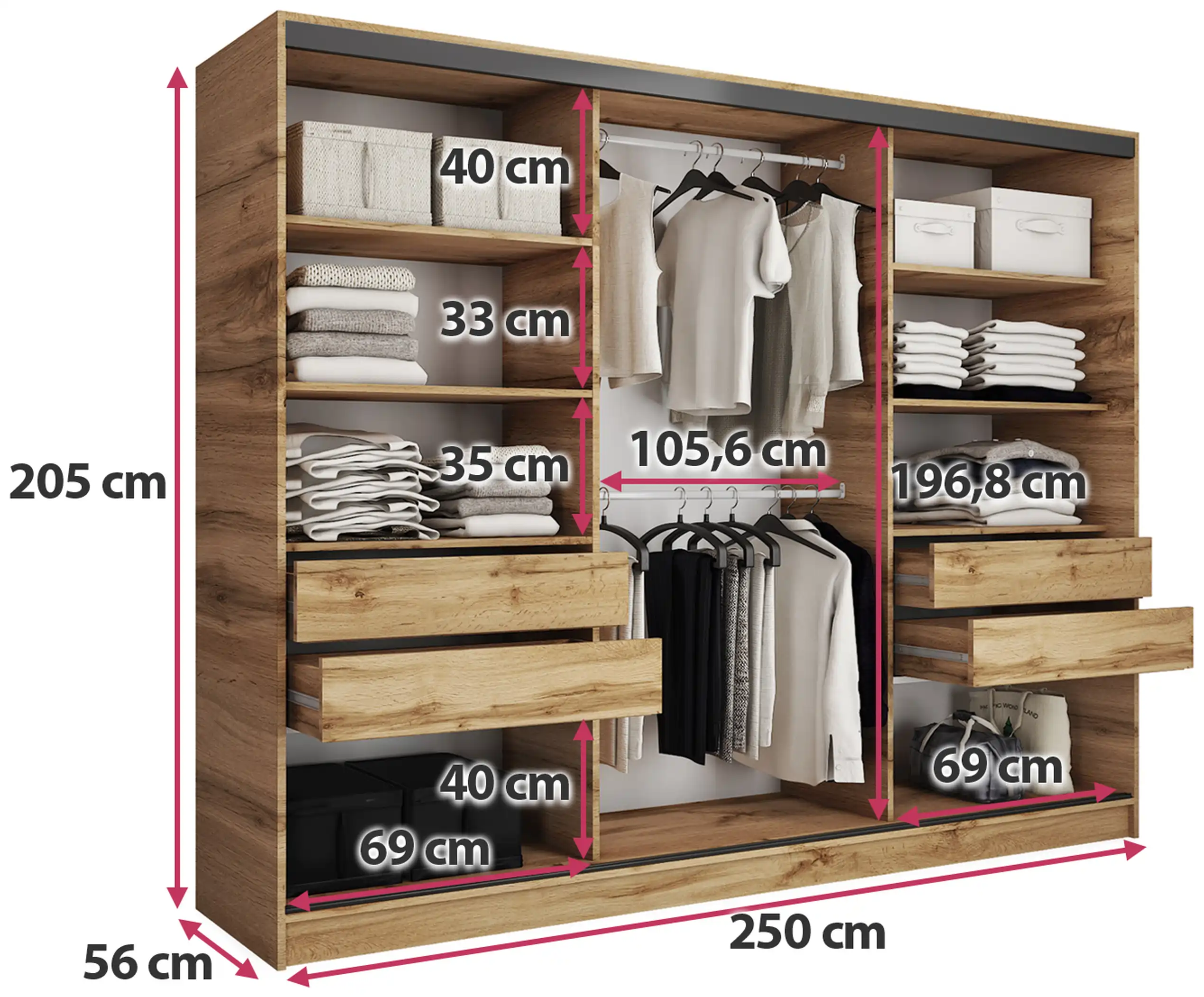 Przedstawiamy szafę przesuwną LOFT o szerokości 250 cm – kwintesencję elegancji i praktyczności, która doskonale wkomponuje się w każde nowoczesne wnętrze. Zaprojektowana z myślą o Twoich codziennych potrzebach, łączy w sobie innowacyjne rozwiązania i stylowy wygląd.
