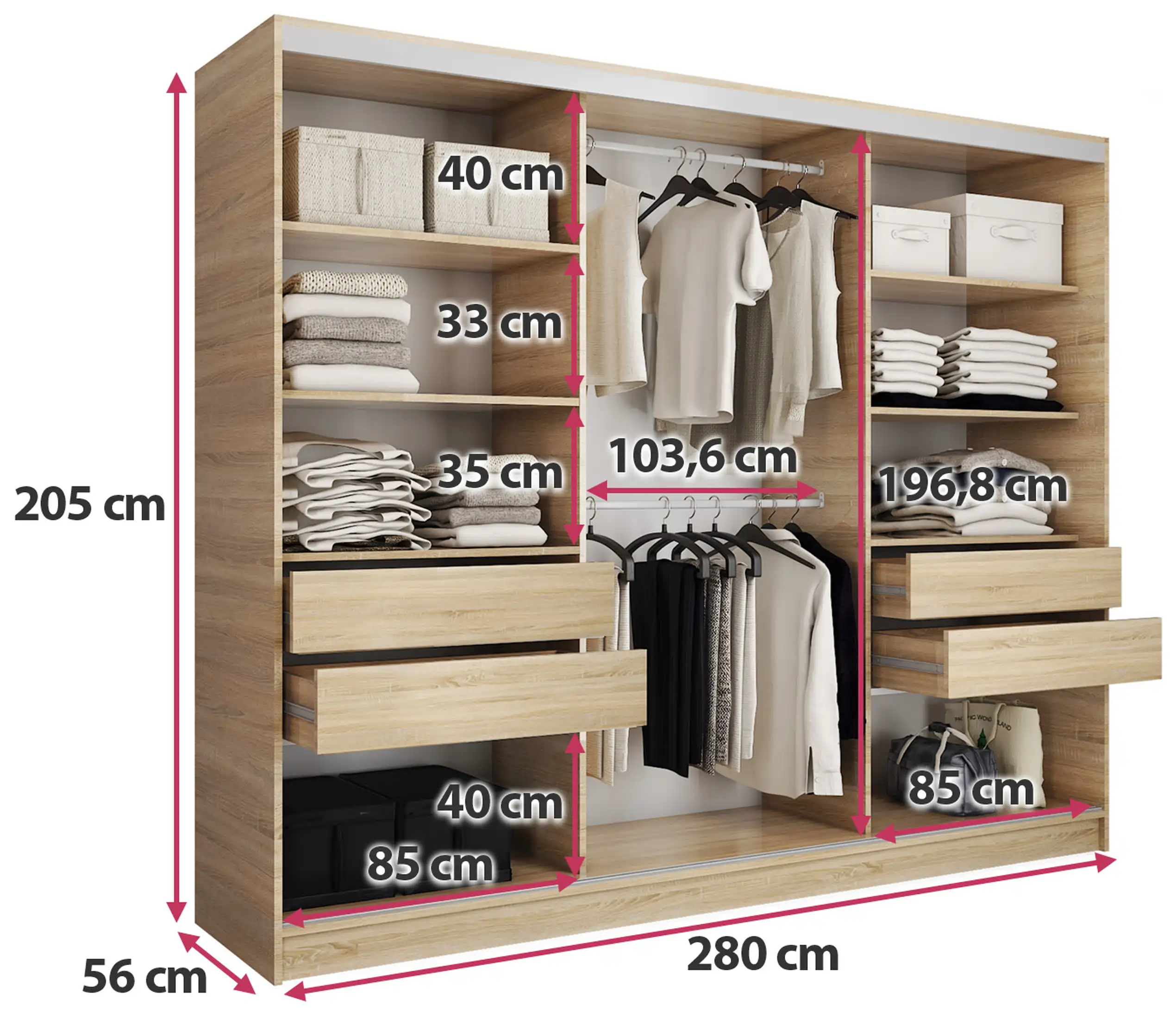 Prezentujemy szafę przesuwną o szerokości 280 cm TOP, doskonale komponującą się z nowoczesnymi wnętrzami dzięki swojej stylistyce oraz kolorowi dąb sonoma. Szafa została wykonana z 16 mm płyty laminowanej, co gwarantuje jej trwałość i stabilność. Brzegi mebla zostały precyzyjnie wykończone okleiną ABS, co zwiększa odporność na uszkodzenia i wilgoć, a także dodaje elegancji.