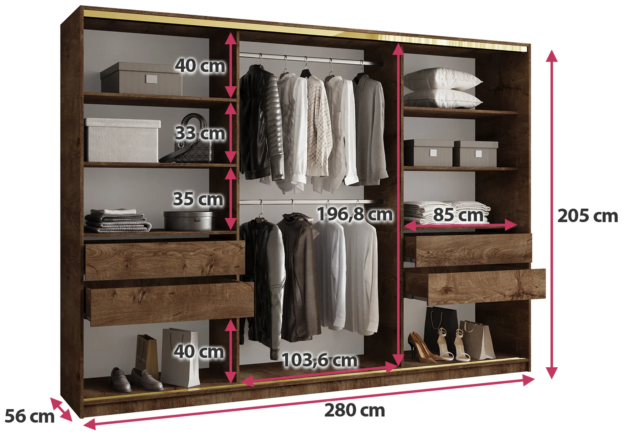 Dodaj swojej sypialni nuty luksusu i porządku dzięki eleganckiej szafie przesuwnej o szerokości 280 cm. Połączenie lustra, złotych detali i praktycznego układu wnętrza sprawia, że to idealne rozwiązanie do przechowywania ubrań, które jednocześnie staje się ozdobą wnętrza. Środkowe drzwi z lustrem optycznie powiększają przestrzeń, a złoty system przesuwny ze szprosami nadaje szafie nowoczesny, a zarazem szykowny charakter.