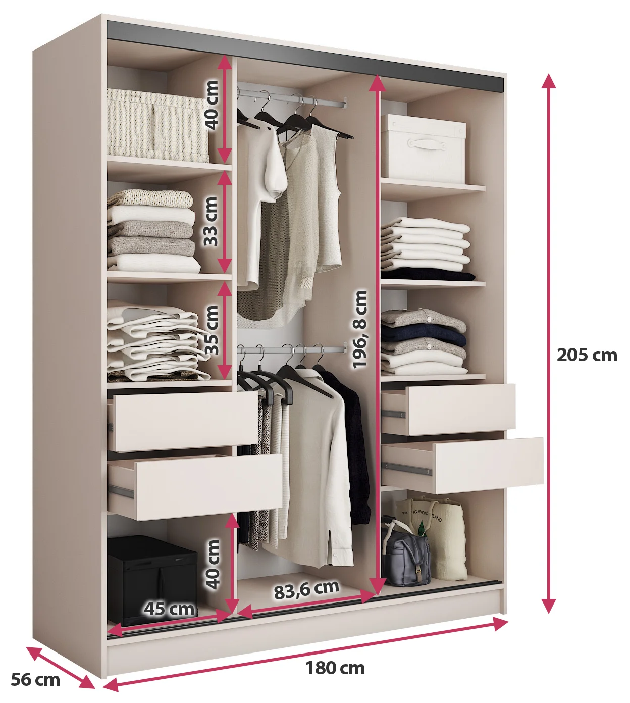 Szafa jest bardzo pojemna, szerokie półki i szuflady pomieszczą bardzo dużo rzeczy. Jestem zadowolona z zakupu i polecam. Minus długi termin oczekiwania , ale uprzedzony na stronie.