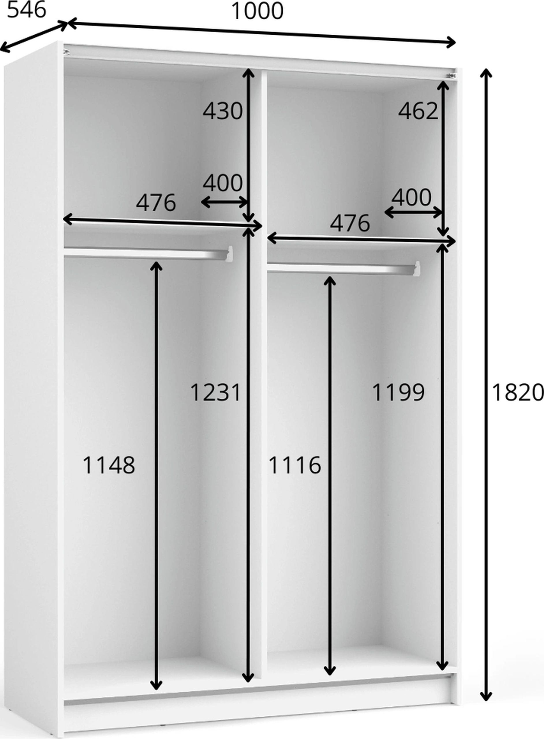 - Wymiary: szerokość 100 cm, wysokość 182 cm, głębokość 54,6 cm