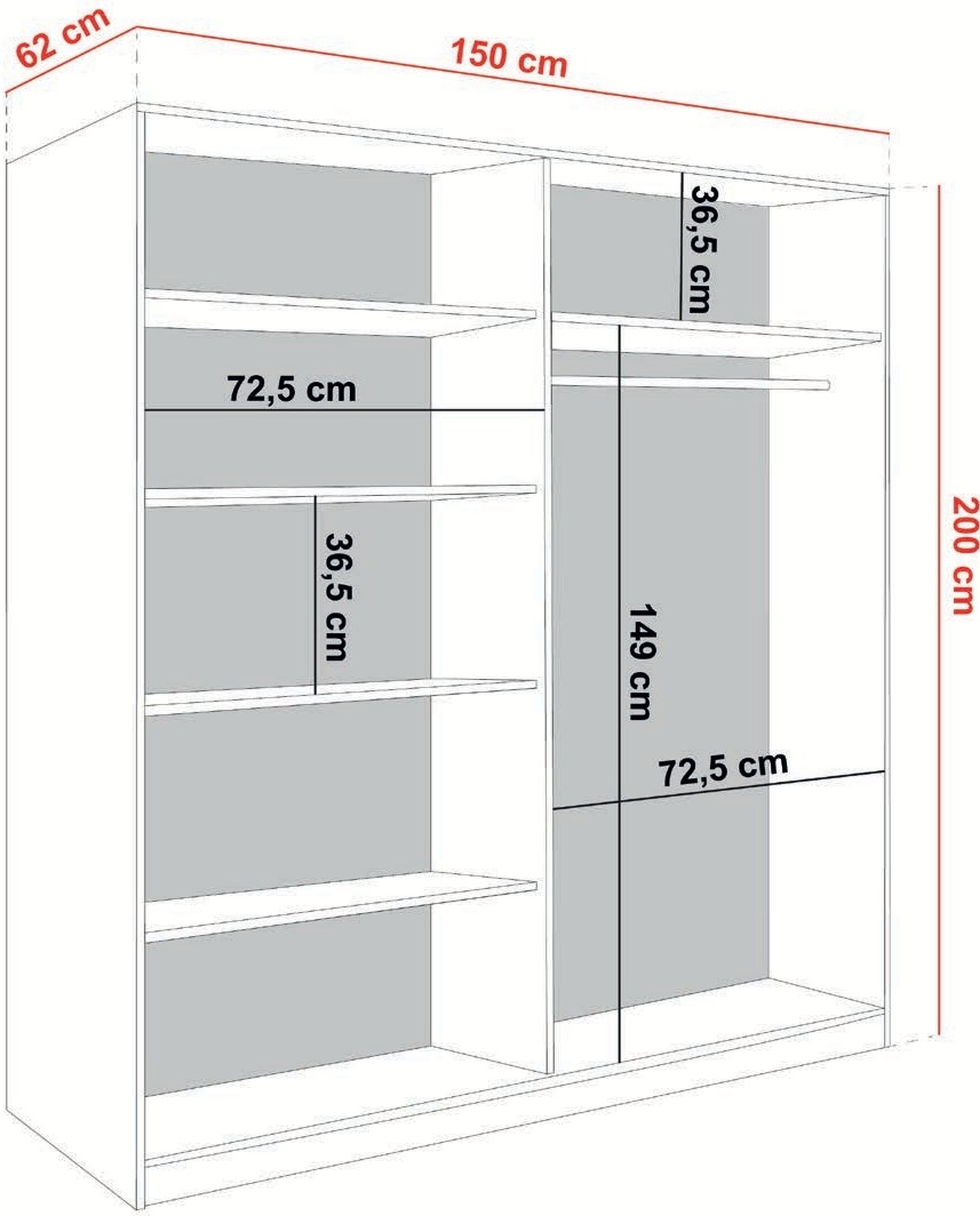 - Wymiary: szerokość 150 cm, wysokość 200 cm, głębokość 62 cm