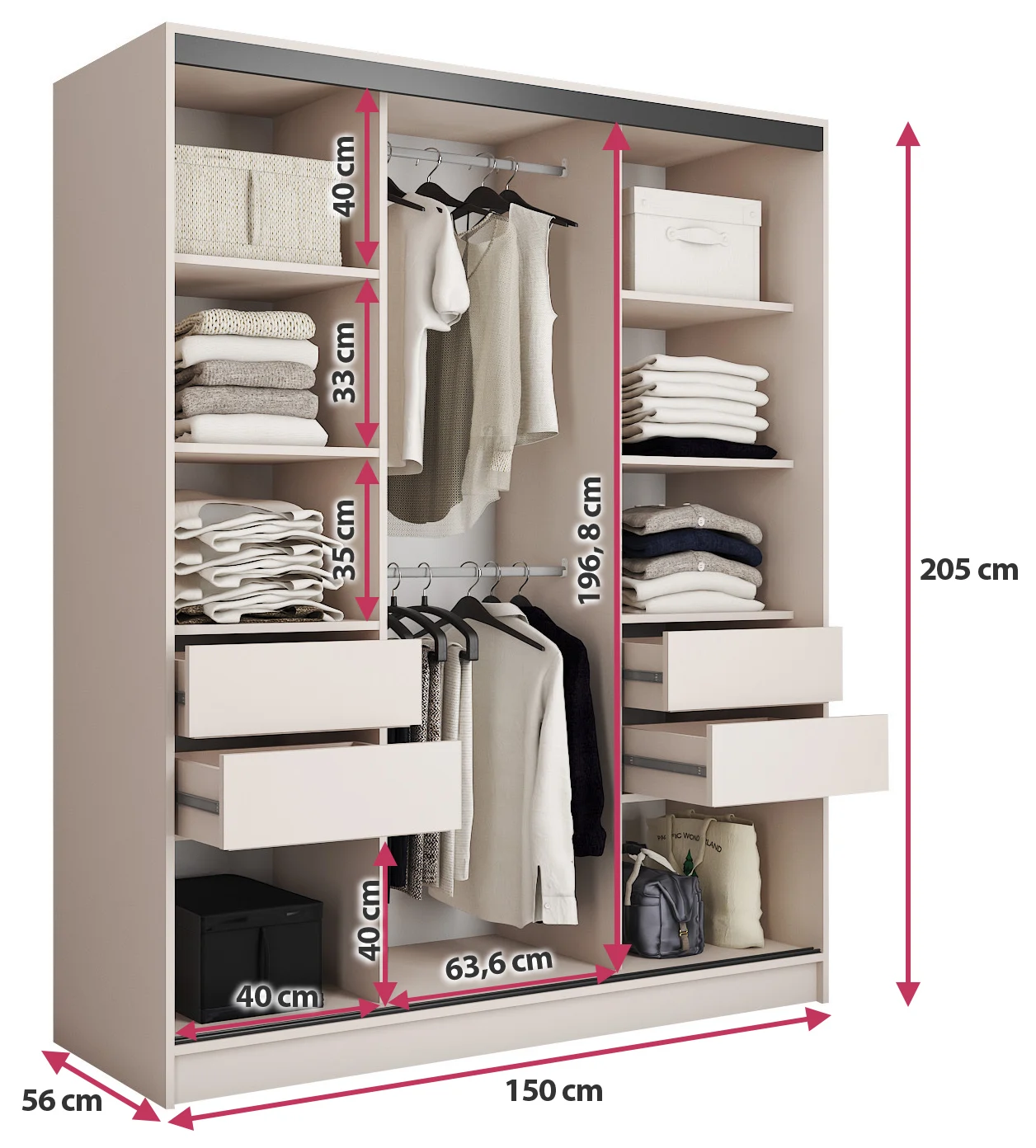 Szafa jest bardzo pojemna, szerokie półki i szuflady pomieszczą bardzo dużo rzeczy. Jestem zadowolona z zakupu i polecam. Minus długi termin oczekiwania , ale uprzedzony na stronie.