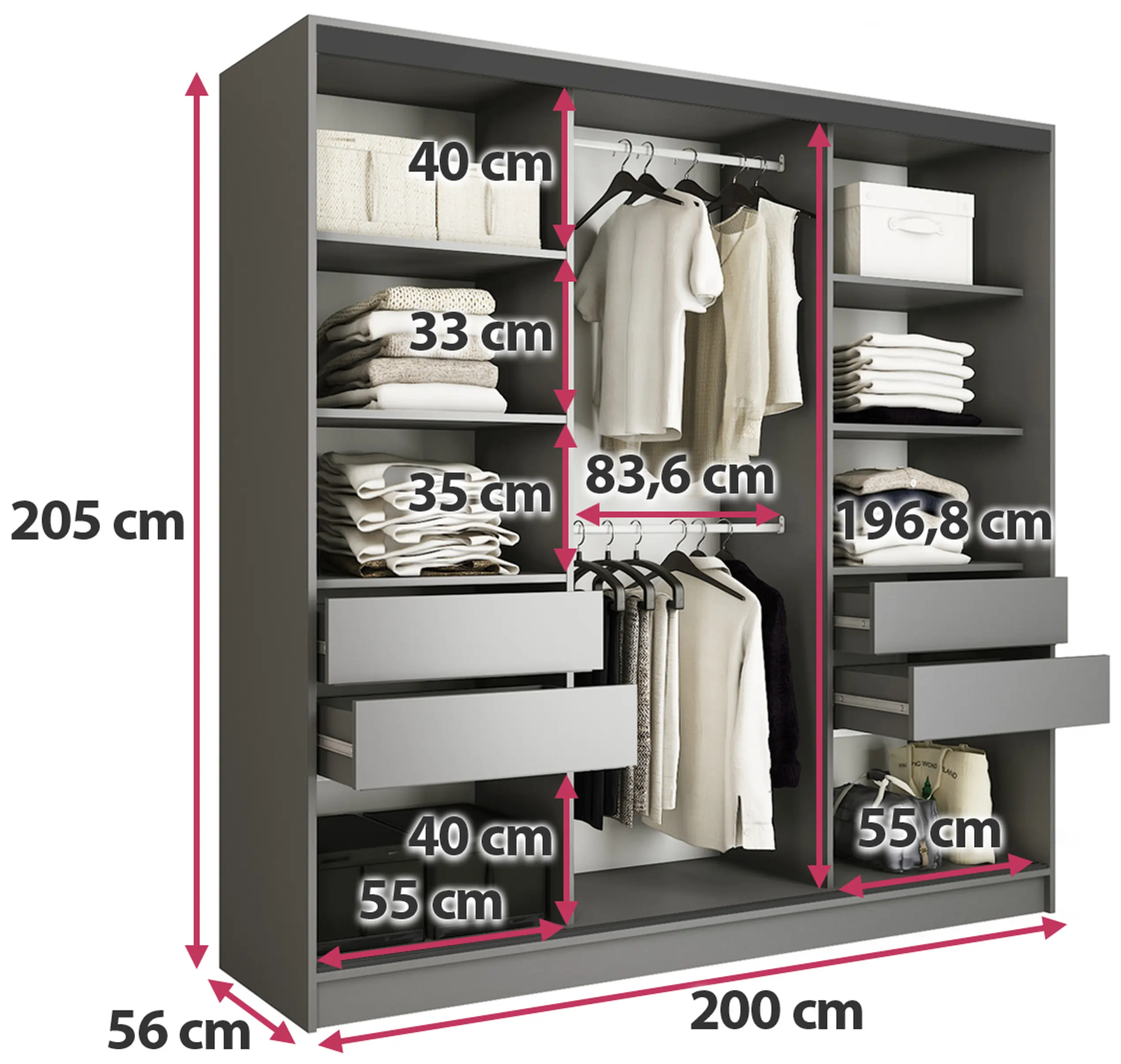 Szafa jest bardzo pojemna, szerokie półki i szuflady pomieszczą bardzo dużo rzeczy. Jestem zadowolona z zakupu i polecam. Minus długi termin oczekiwania , ale uprzedzony na stronie.