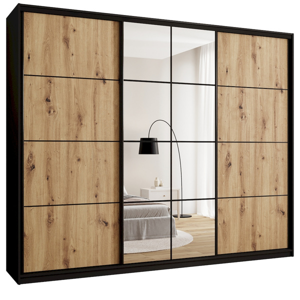 Szafa przesuwna ADRE jest bardzo pojemną propozycją, która doskonale sprawdza się w sypialniach osób uwielbiających trzymać ubrania w jednym miejscu. Szafa została wyposażona w lustro frontowe, natomiast wewnątrz swoje miejsce znalazły liczne półki na ubrania oraz cztery szuflady umieszczone symetrycznie po bokach. W centralnej części szafy znajdują się dwie półki oraz drążek na wieszaki umieszczony pod nimi.