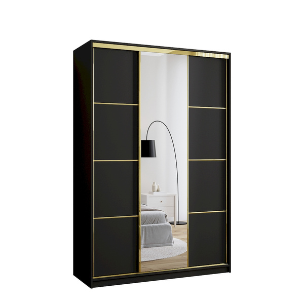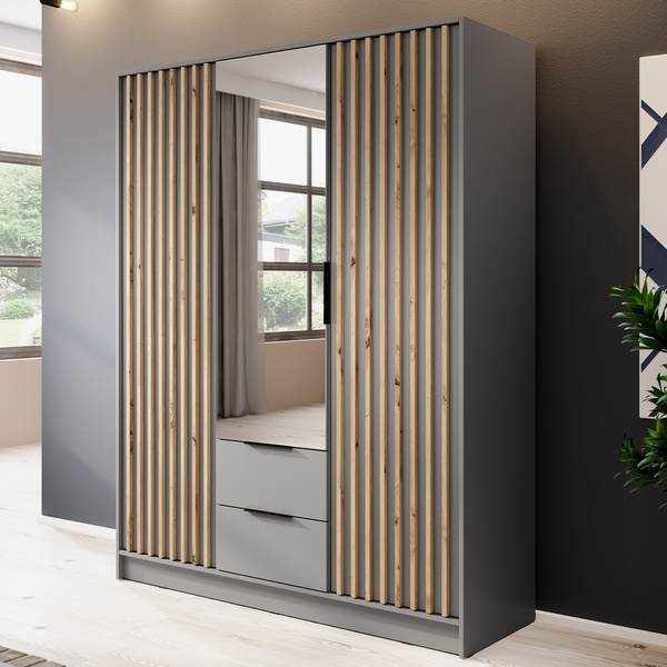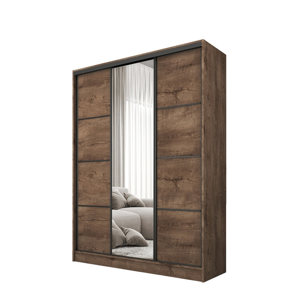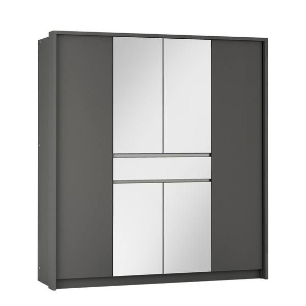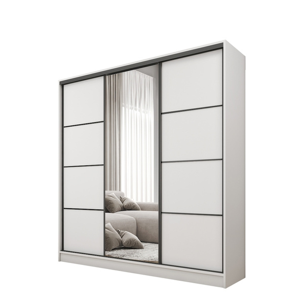 Szafa przesuwna ADRE jest bardzo pojemną propozycją, która doskonale sprawdza się w sypialniach osób uwielbiających trzymać ubrania w jednym miejscu. Szafa została wyposażona w lustro frontowe, natomiast wewnątrz swoje miejsce znalazły liczne półki na ubrania oraz cztery szuflady umieszczone symetrycznie po bokach. W centralnej części szafy znajdują się dwie półki oraz drążek na wieszaki umieszczony pod nimi.