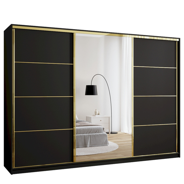 Szafa wyposażona jest w trzy przesuwne drzwi na solidnym stalowym systemie przesuwnym w eleganckim czarnym kolorze. Taka konstrukcja zapewnia nie tylko estetyczny wygląd, ale również oszczędność miejsca w sypialni czy garderobie. Czarne stalowe uchwyty dopełniają całości, podkreślając nowoczesny charakter mebla.