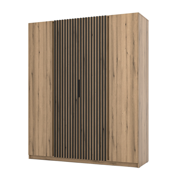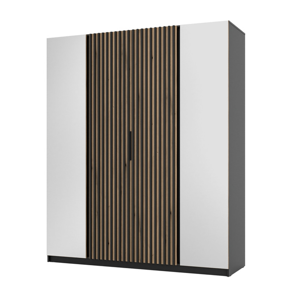 Korpus oraz front szafy z lustrem i lamelami wykonano z płyty laminowanej o grubości 16 mm, co zapewnia jej trwałość i solidność. Dwa środkowe drzwi zostały ozdobione lamelami, które dodają szafie nowoczesnego i stylowego wyglądu. Boczne drzwi wyposażone w lustra optycznie powiększają przestrzeń i wprowadzają więcej światła do wnętrza, co czyni sypialnię jaśniejszą i bardziej przestronną.