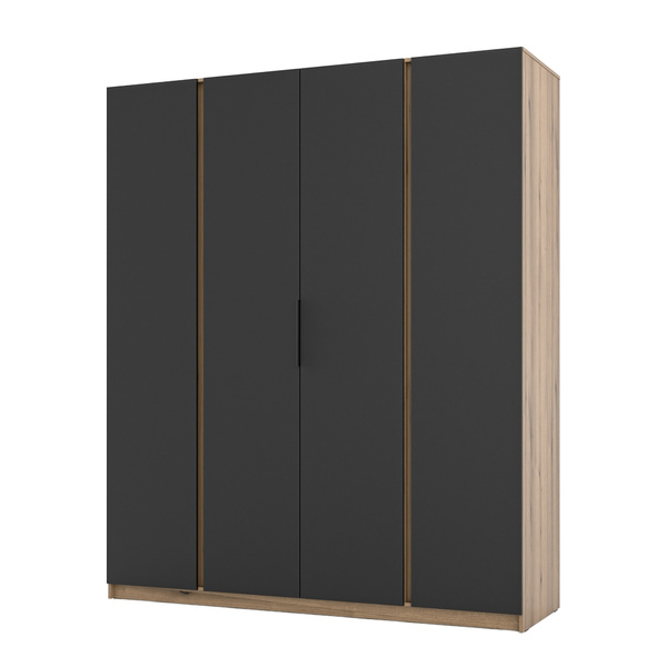 Uchwyty szafy wykonane z aluminium w eleganckim czarnym kolorze podkreślają nowoczesny charakter mebla, zapewniając jednocześnie wygodę użytkowania.