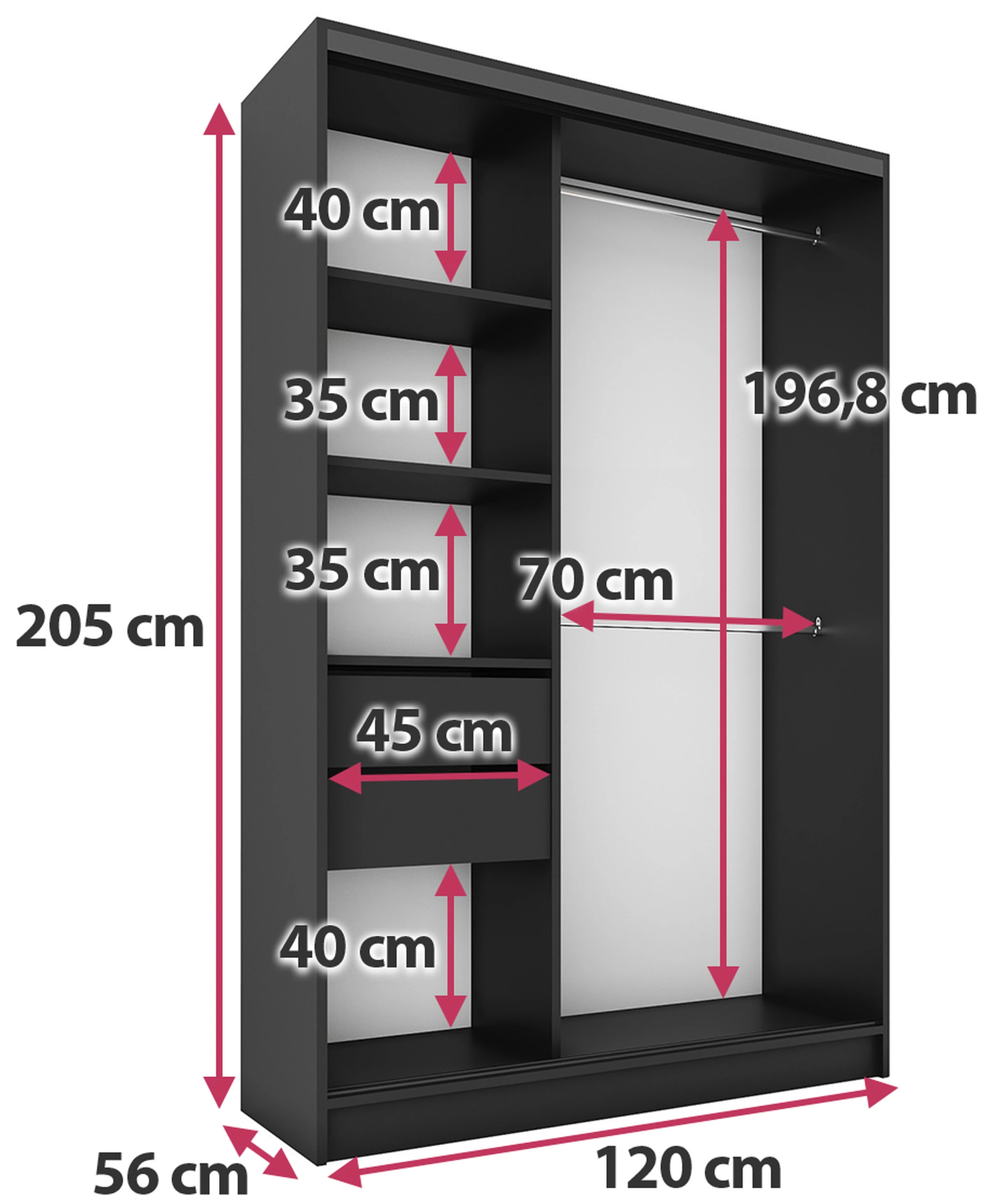 Szafa na zdjęciu wygląda super w rzeczywistości również. Mimo kilku błędów szafa jest całkiem ok. Przede wszystkim głębokość na część z drążkami ( tam na wieszaki) ma tylko 46 cm a nie jak podane jest na stronie 56 cm. Przy zamykaniu koszule, kurtki przeszkadzają przy zamykaniu, haczą. Jeżeli już zdecydujecie się na zakup to uważajcie na instrukcję a zwłaszcza na punkty 1 i 2 bo powinny być odwrotnie. Części które są narysowane w instrukcji odbiegają od tego co się dostaje fizycznie ( może dostałem z innego modelu ).