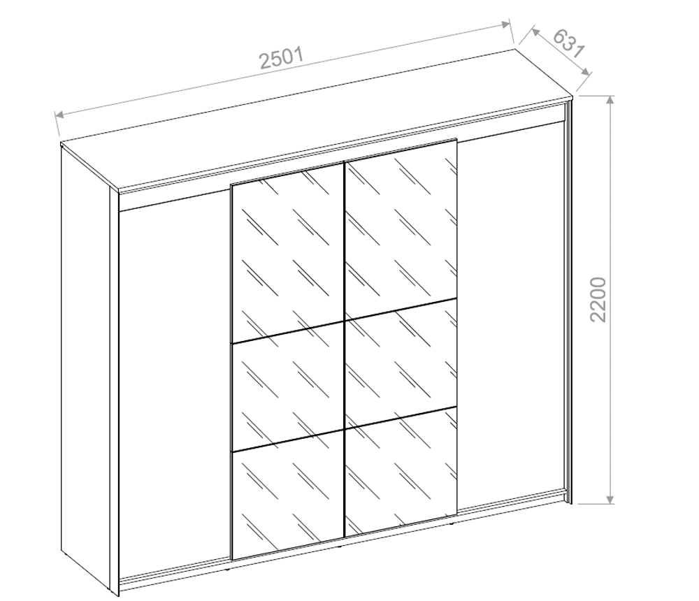 Szafa została wyposażona w czworo drzwi otwieranych za pomocą bezuchwytowego mechanizmu push to open z lustrem o modernistycznym kształcie, które optycznie powiększa, oraz rozjaśnia pomieszczenie w niepowtarzalny sposób. Za drzwiami szafy znajdują się liczne półki pozwalające na umieszczenie znacznej części elementów garderoby oraz dwa drążki na wieszaki z ubraniami o różnej długości.
