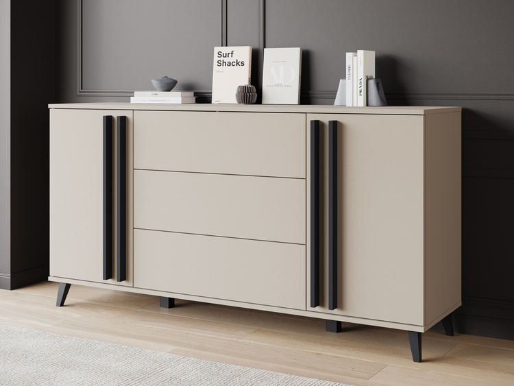 • Fronty wykonano z solidnej płyty MDF o grubości 16 mm w kolorze beżowym, z matowym wykończeniem.