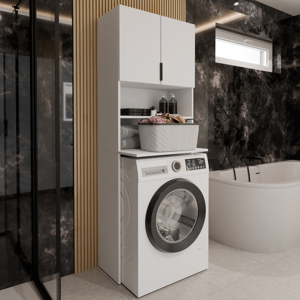 Zamów szafkę nad pralkę w czarno-białym wykończeniu i wprowadź elegancję oraz porządek do swojej łazienki!