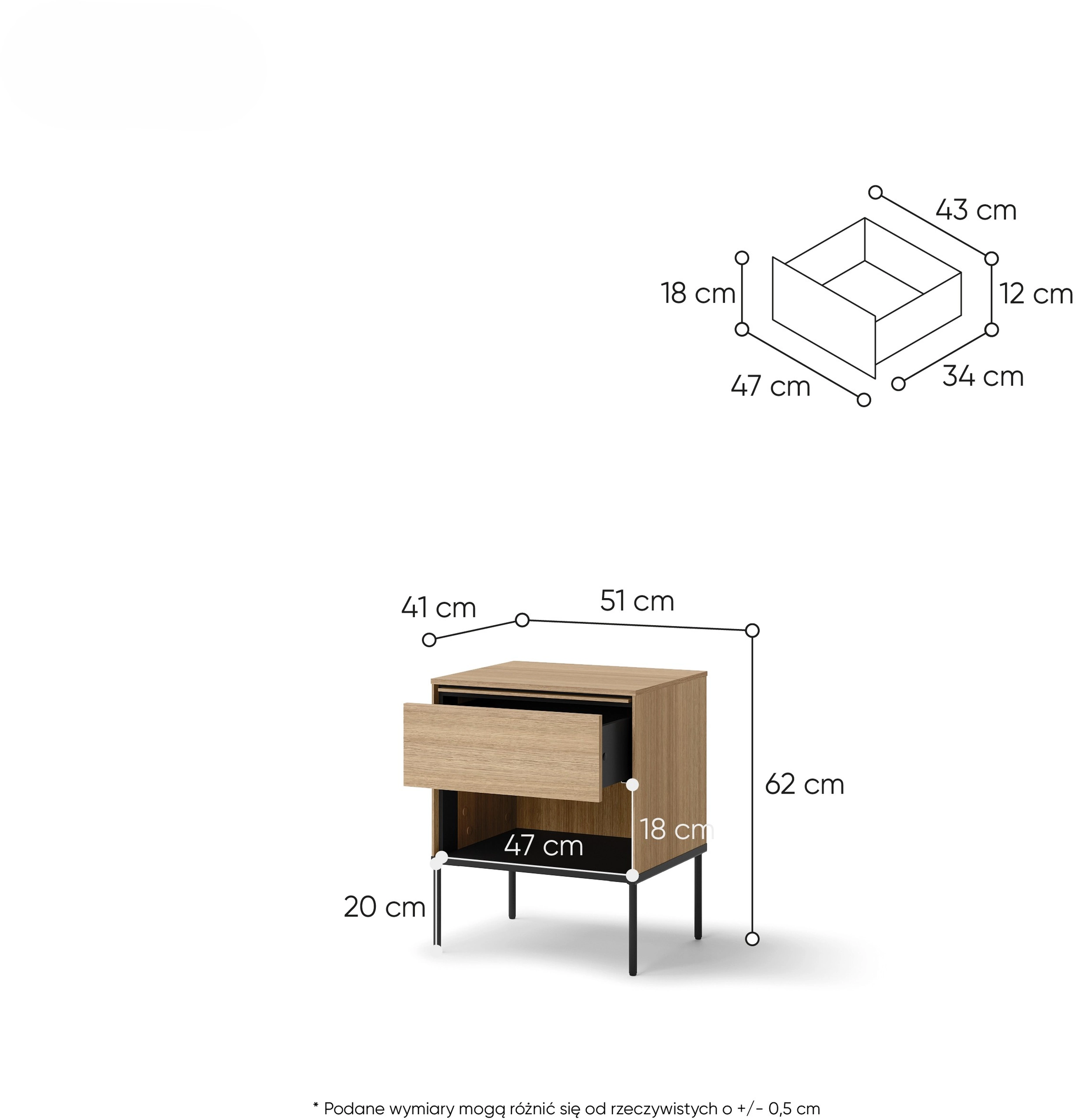 Stolik nocny to nie tylko funkcjonalny mebel, ale też wyraz stylu. Szuflada z czarnym wnętrzem i głęboką przestrzenią pomieści wszystkie drobiazgi, które warto mieć pod ręką. Otwarta półka z kolei pozwala szybko sięgnąć po książkę lub schować pudełko z akcesoriami.