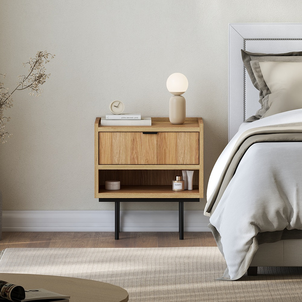 Szafka nocna ELVIO w kolorze hikora naturalna to idealny wybór dla miłośników jasnych, harmonijnych wnętrz. Jej subtelne, drewniane wybarwienie wprowadza do sypialni przytulność i spokój, a kompaktowa konstrukcja z szufladą i otwartą półką pozwala na wygodne przechowywanie najpotrzebniejszych rzeczy tuż obok łóżka.