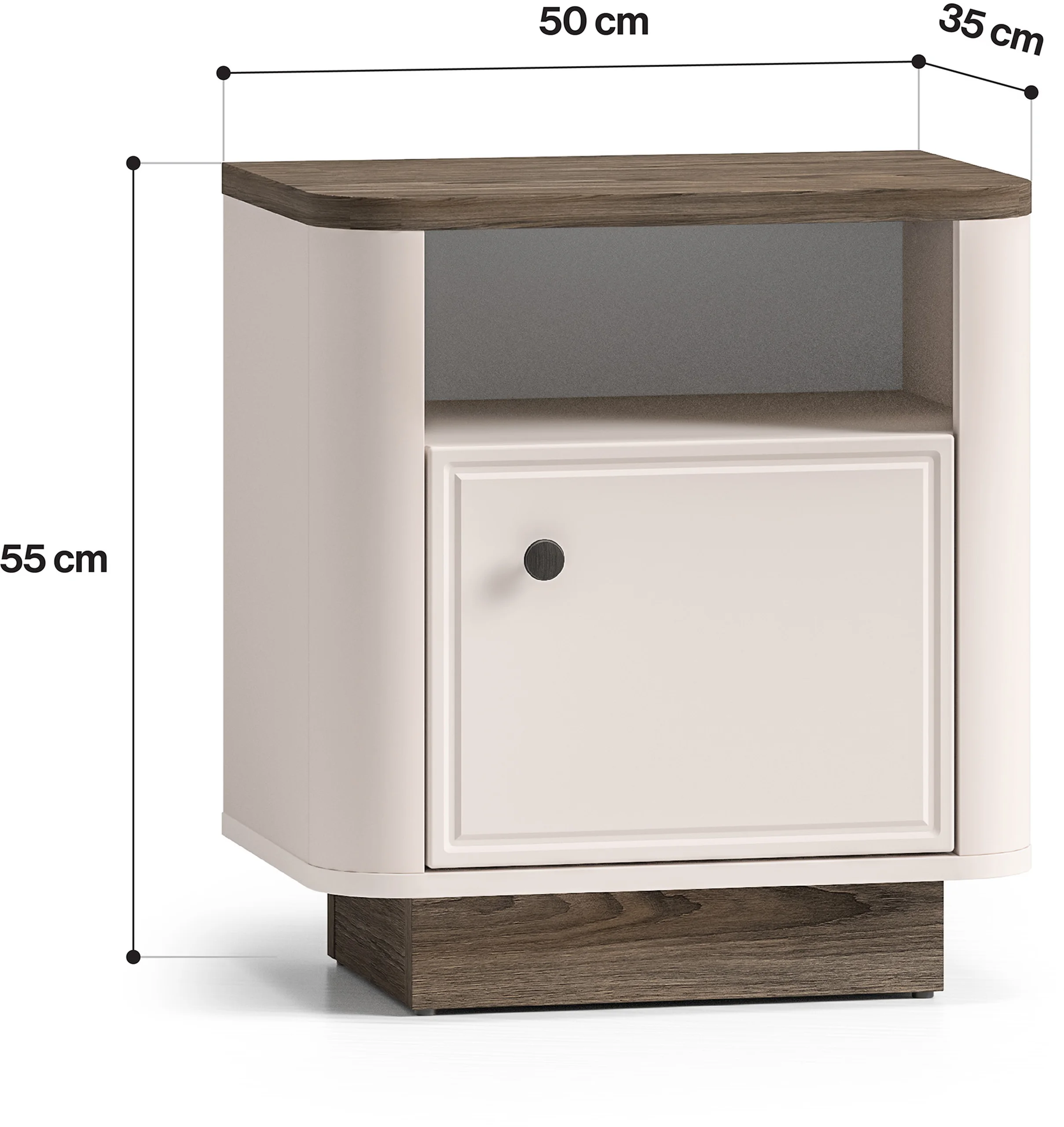 Szafka nocna VILANO została zaprojektowana tak, by łączyć funkcjonalność z estetyką. Jej kompaktowe wymiary 50 × 35 cm pozwalają ustawić ją nawet w niewielkich sypialniach, a jednocześnie zapewniają wystarczająco dużo miejsca na niezbędne przedmioty. To mebel, który wprowadza do wnętrza równowagę, wygodę i elegancję.