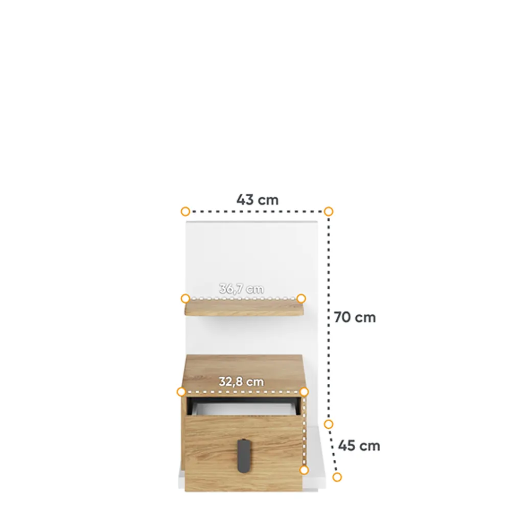 Szafka dziecięca SIMI została wyposażona w półkę znajdującą się u góry, pod którą znajduje się przestrzeń pozwalająca na umieszczenie lampki nocnej oraz drobnych akcesoriów. Szafka nocna do pokoju dziecięcego posiada pojemną szufladę z uchwytem wykonanym z metalu, w której zmieści się wiele drobnych akcesoriów sypialnianych. Doskonale sprawdzi się ona również do umieszczenia lampki nocnej, która pozwala zyskać dodatkowe oświetlenie podczas spędzania wolnego czasu przy lekturze.