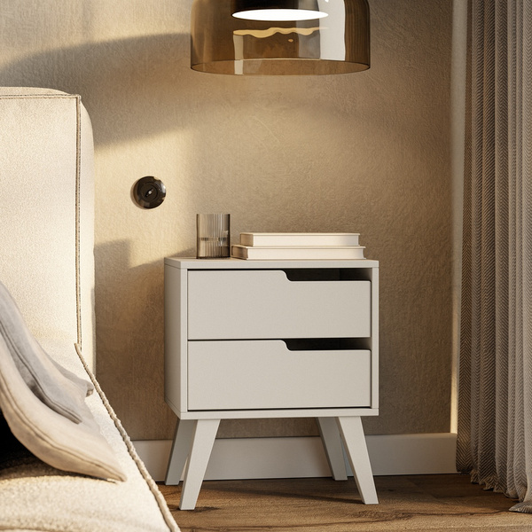 • Szafka nocna NIVARO w kolorze kaszmir ma dwie pojemne szuflady i wysokie drewniane nóżki, które dodają lekkości i ułatwiają sprzątanie. Kompaktowe wymiary sprawdzą się w każdej sypialni, a płyta laminowana z obrzeżem ABS zapewnia trwałość i wygląd.