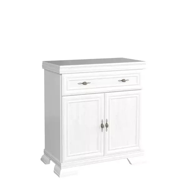 - Szuflada szafki została osadzona na prowadnicach wzbogaconych bezgłośnym mechanizmem cichego domyku.