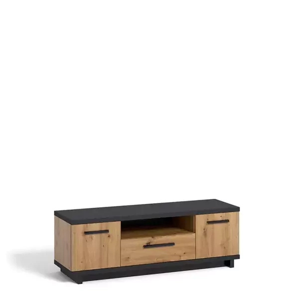 Szafka rtv ma 140 cm szerokości. Drewnopodobny korpus w dekorze dąb woatn w połączeniu z czarnymi frontami na wysoki połysk prezentuje się bardzo nowocześnie, więc jeśli szukasz nowoczesnej szafki rtv, jest to model dla Ciebie.