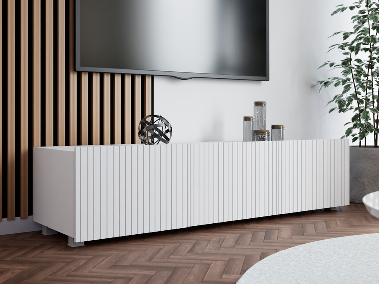Szafka RTV TAMORIS to doskonały wybór do nowoczesnego lub skandynawskiego salonu. Jej kompaktowa szerokość 153 cm sprawia, że sprawdzi się zarówno w większych przestrzeniach, jak i w mniejszych pokojach dziennych. Dzięki dwóm zamykanym szafkom i otwartym półkom z łatwością uporządkujesz sprzęt RTV, dekodery czy kolekcję filmów.