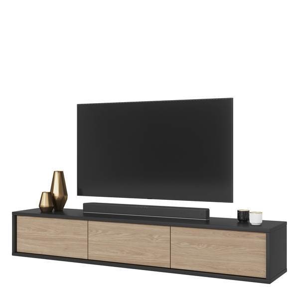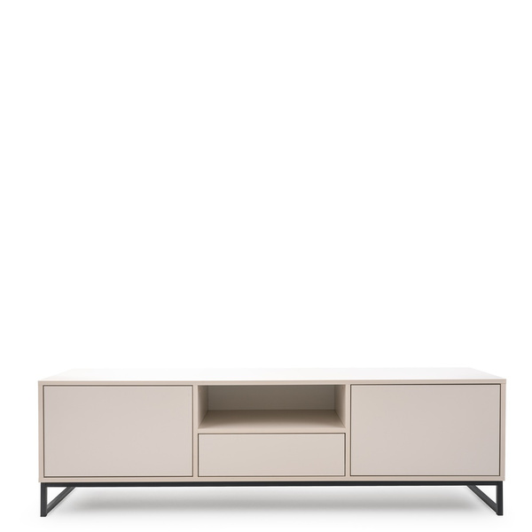 Szafka RTV MAVIO to doskonałe połączenie designu i funkcjonalności. W centralnej części znajduje się otwarta wnęka, która idealnie sprawdzi się na dekodery, konsole i inne urządzenia multimedialne. Tuż pod nią umieszczono uchylny front, kryjący dodatkową przestrzeń na drobiazgi. Po bokach znajdują się zamknięte szafki z drzwiami, które pomogą Ci zachować porządek i ukryć mniej estetyczne akcesoria.