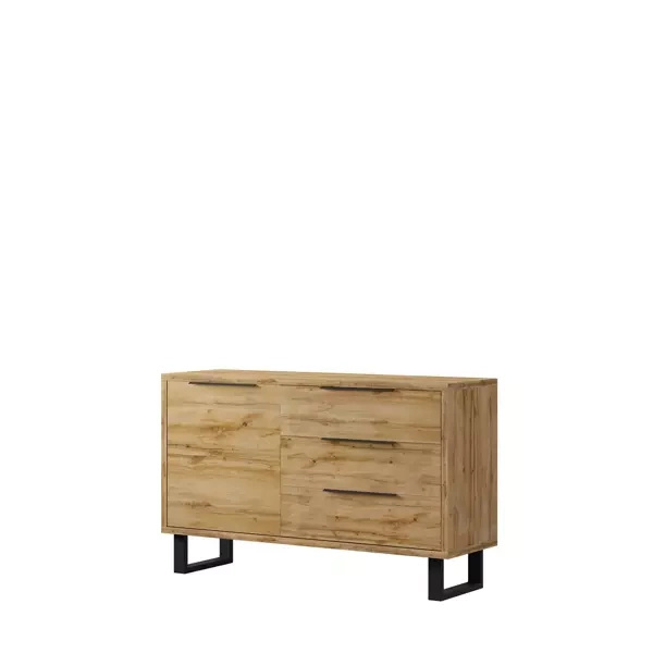 Cała konstrukcja oparta jest na wysokich, metalowych nóżkach w kolorze czarnym, które nadają szafce lekkiego i nowoczesnego wyglądu. Nóżki te podkreślają industrialny charakter mebla, a jednocześnie ułatwiają utrzymanie czystości pod szafką, co jest praktycznym rozwiązaniem w codziennym użytkowaniu.