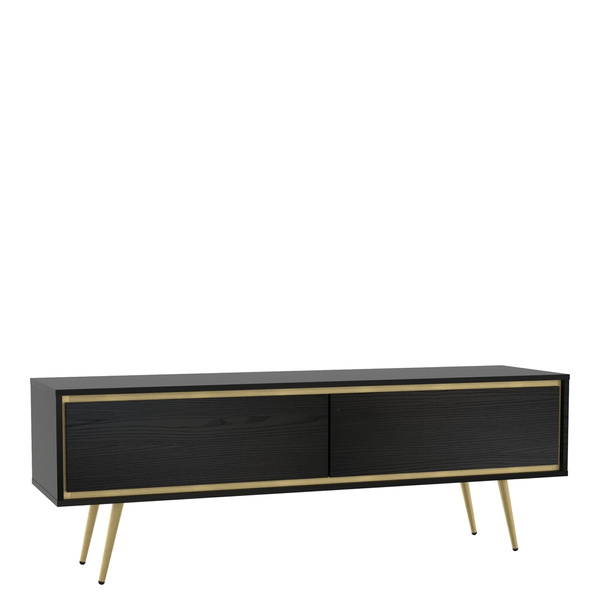 Pojemna szafka rtv o szerokości 159 cm wyposażona w dwie pary drzwiczek uchylnych, za którymi znajdują się półki oraz dwie szuflady.