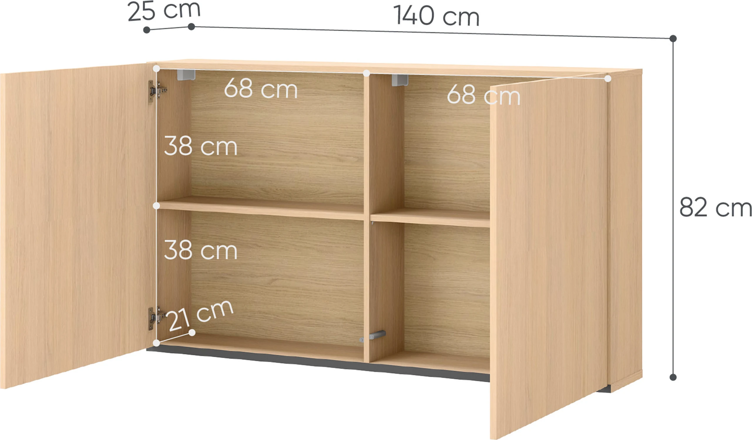 Szafka wisząca WOOW o szerokości 141 cm to idealne rozwiązanie dla nowoczesnych przestrzeni młodzieżowych. Dzięki dwóm zamykanym frontom i czterem pojemnym półkom, z łatwością pomieści książki, gry, zeszyty czy dekoracje. Wykończenie w ciepłym odcieniu dębu Vincenza wprowadza przytulny klimat, a system push to open nadaje całości minimalistycznego charakteru.