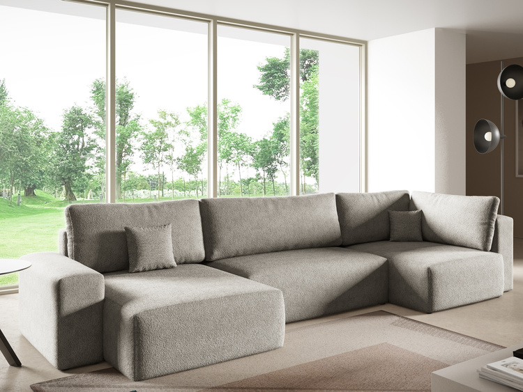 Oprócz funkcjonalności narożnik z funkcją spania CAMILO DUO zachwyca swoją kolorystyką. Tkanina boucle dodaje meblowi subtelnej elegancji, a neutralne kolory tkaniny są łatwe do dopasowania do różnorodnych wnętrz. Komplet trzech dużych poduch oparciowych oraz dwóch mniejszych poduszek zapewnia nie tylko komfort, ale także stanowi stylowe uzupełnienie całości.