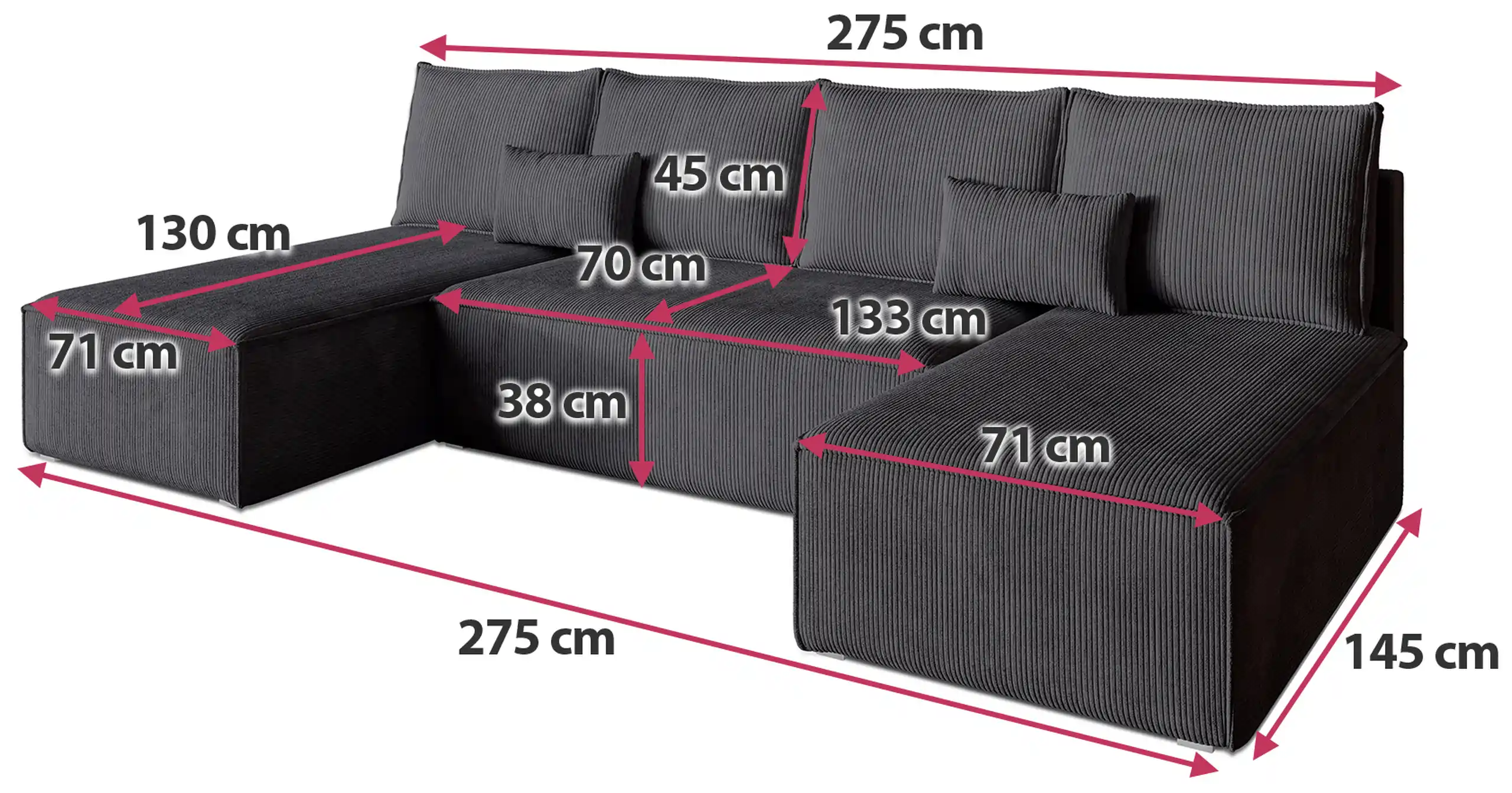 Narożnik w kształcie U z tkaniny sztruksowej to idealne połączenie komfortu, stylu i praktyczności. Jego unikalny kształt umożliwia wygodne rozmieszczenie go w przestronnym salonie, zapewniając miejsce do relaksu dla całej rodziny oraz gości.