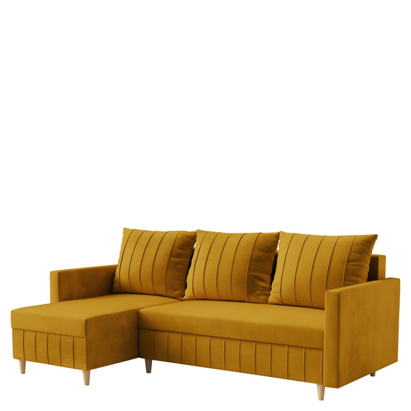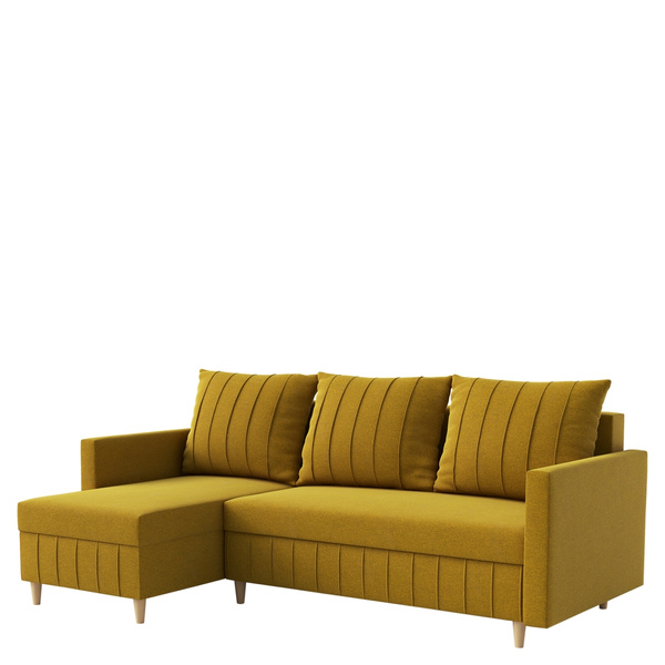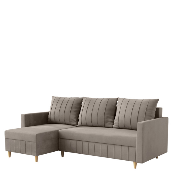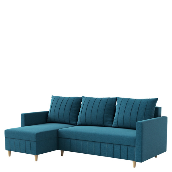 Rozkładana funkcja spania o wymiarach 130x233 cm pozwala w kilka chwil zamienić narożnik w wygodne łóżko. Dodatkowy pojemnik na pościel ukryty pod siedziskiem pomaga utrzymać porządek i maksymalnie wykorzystać przestrzeń w salonie.