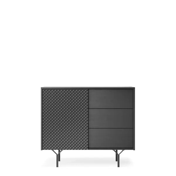 • Wysokie metalowe nóżki w kolorze czarnym dbają o stabilność komody, a także dodatkowo ułatwiają utrzymanie czystości w pomieszczeniu.