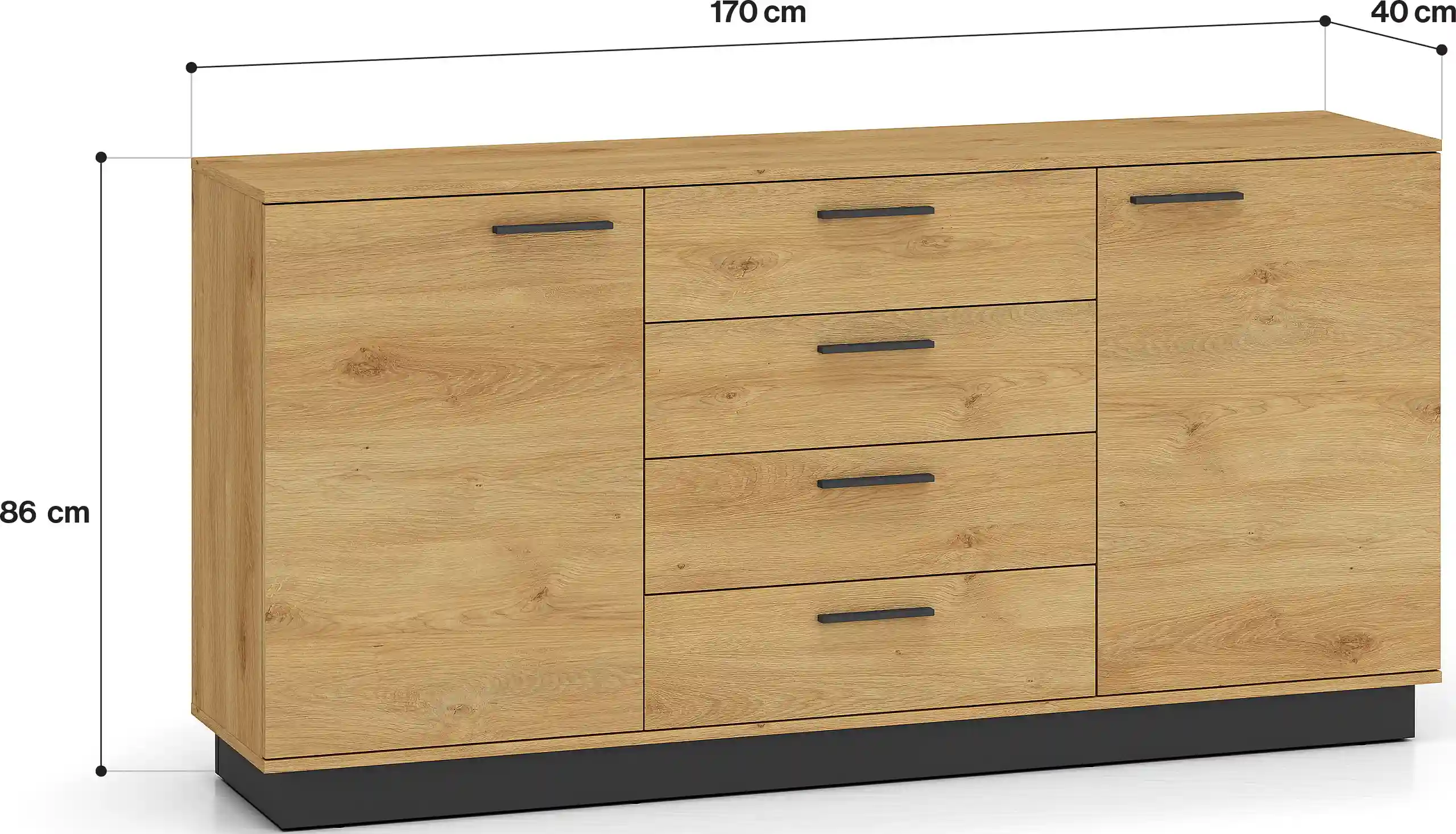Komoda loftowa do salonu MONELLI o szerokości 170 cm to elegancka i niezwykle funkcjonalna propozycja do nowoczesnych wnętrz. Wykończona w ciepłym odcieniu dąb stylowy, przyciąga wzrok industrialnym charakterem, a jednocześnie zapewnia wygodne miejsce do przechowywania najpotrzebniejszych rzeczy. Cztery szuflady i dwie szafki z cichym domykiem sprawiają, że MONELLI to komoda, która sprosta wymaganiom nawet najbardziej wymagających domowników.