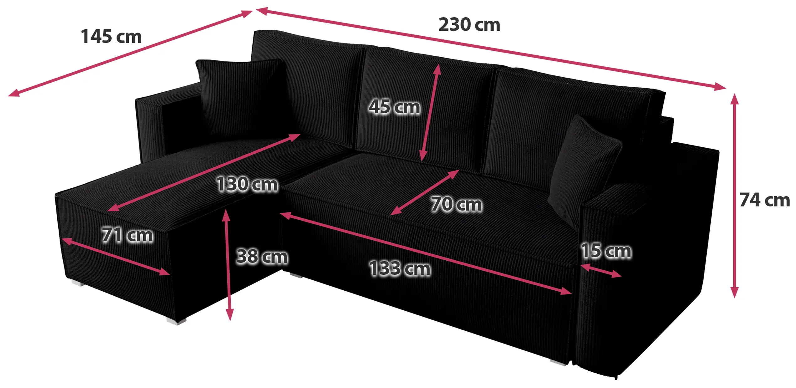O funkcjonalność rogówki zadba przestronny pojemnik pod siedziskiem - idealny do przechowywania pościeli lub koców, a także funkcja spania, dzięki której narożnik do salonu z łatwością zamieni się w komfortowe miejsce do spania.