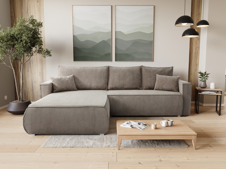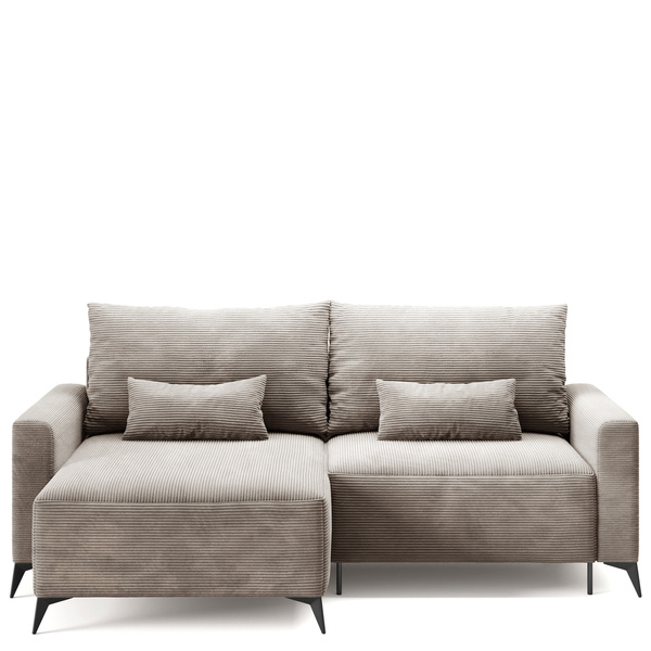Obicie z miękkiego sztruksu nadaje narożnikowi wyjątkowy charakter, a jego neutralny odcień pasuje do różnych aranżacji wnętrz. Tapicerowany tył sprawia, że mebel prezentuje się świetnie niezależnie od ustawienia – zarówno pod ścianą, jak i w centralnej części pokoju.