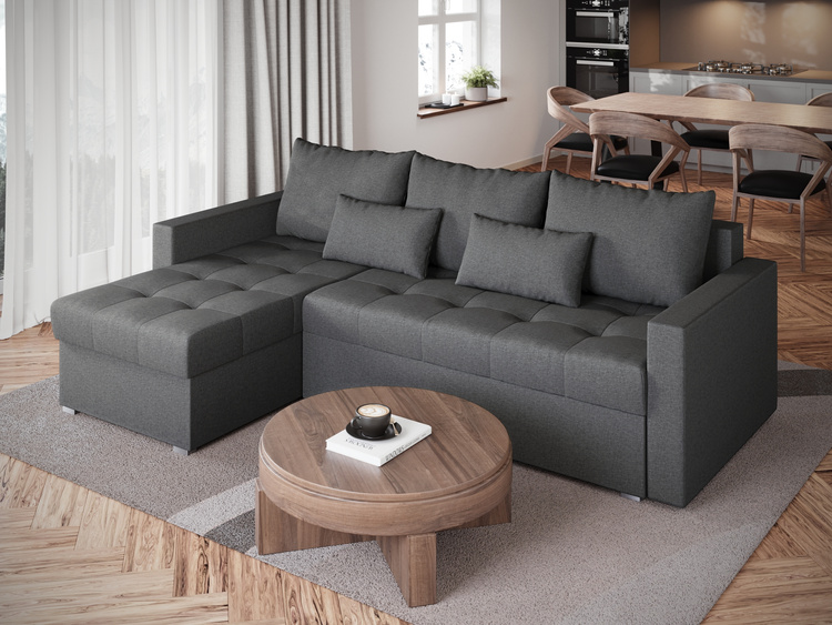 Dzięki funkcji spania o wymiarach 120x236 cm narożnik z łatwością zamienia się w wygodne łóżko. To doskonałe rozwiązanie zarówno dla gości, jak i na co dzień. Wbudowany pojemnik na pościel pozwala na przechowywanie koców i poduszek, pomagając utrzymać porządek w salonie.