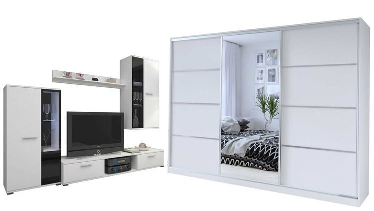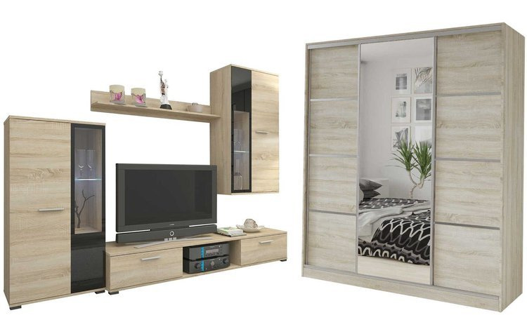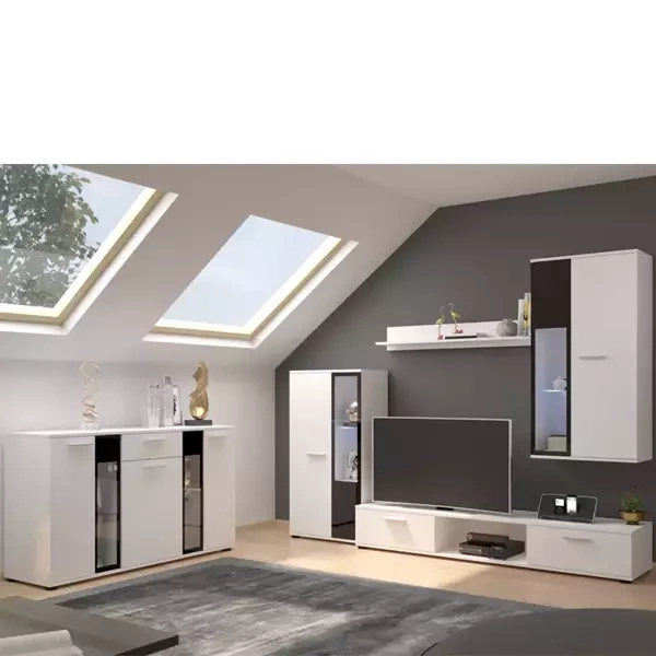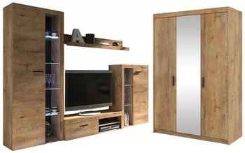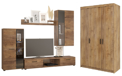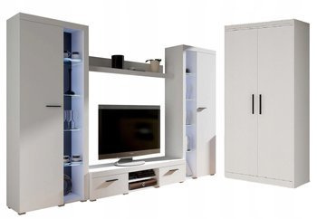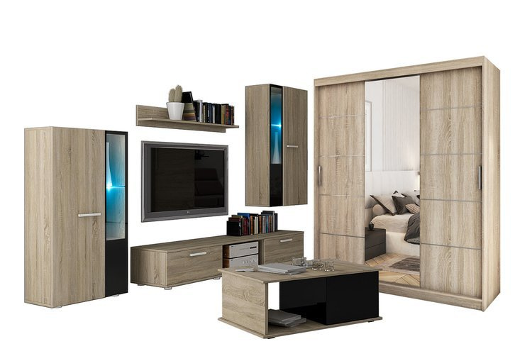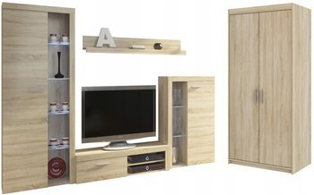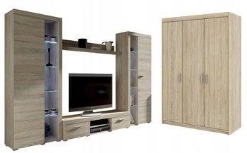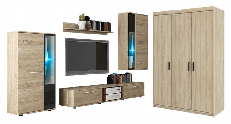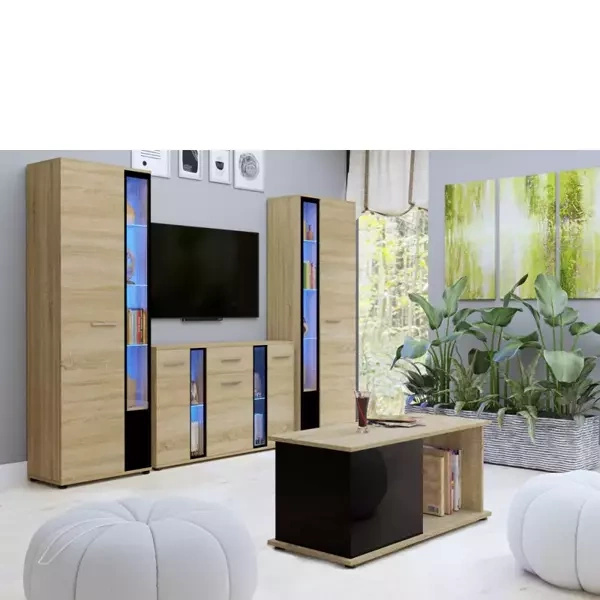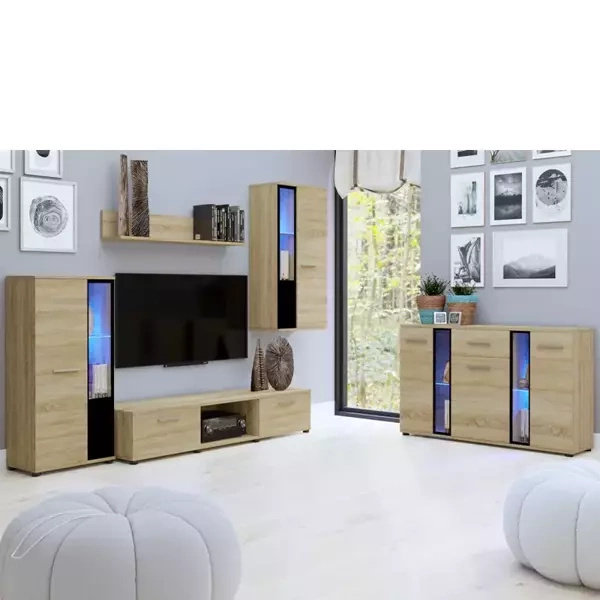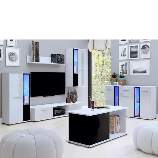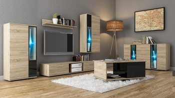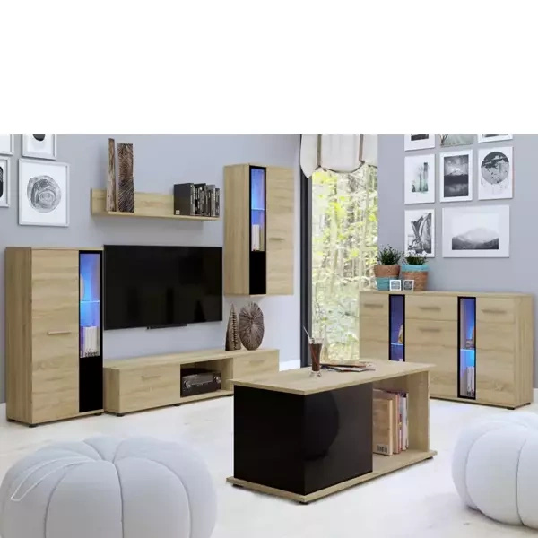 Szafka RTV i komoda zostały zaprojektowane z myślą o funkcjonalności, oferując obfitość przestrzeni na przechowywanie, które pozwala utrzymać idealny porządek. Dwie wiszące witryny, wyposażone w szklane półki, stanowią doskonałe miejsce do wyeksponowania ulubionych przedmiotów. Dodatkowym atutem jest możliwość podświetlenia ich za pomocą ledów, co tworzy efektowny i ciepły klimat. Ława z nowoczesnym designem, będzie świetnym uzupełnieniem do wieczornych spotkań na kanapie.