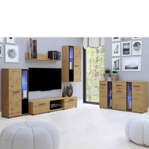 Meble do salonu z kolekcji KUBA to modny i elegancki zestaw, który odpowiada na potrzeby najbardziej wymagających Klientów. Kolekcja bazuje na prostocie brył i charakterystycznych szklanych wstawkach we frontach ze szkła typu lacobel. W skład meblościanki wchodzą dwie witryny - dające dużo miejsca na przechowywanie. Półka na książki lub inne ozdoby. Szafka RTV, która jest podzielona na dwie szafeczki po zewnętrznych stronach, a pośrodku znajduje się wnęka.