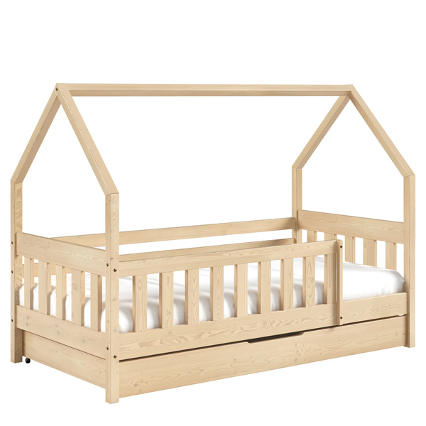 - Solidna konstrukcja łóżka wykonana jest z wytrzymałej płyty wiórowej, MDF oraz drewna sosnowego, co gwarantuje stabilność i długotrwałą wytrzymałość mebla.
