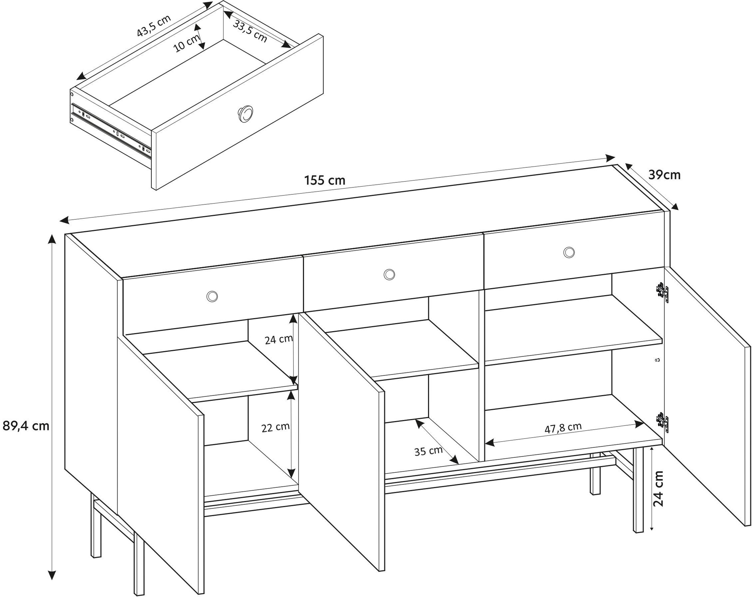 - Wymiary całkowite: 155 cm (szer.) × 39 cm (gł.) × 89,4 cm (wys.)
