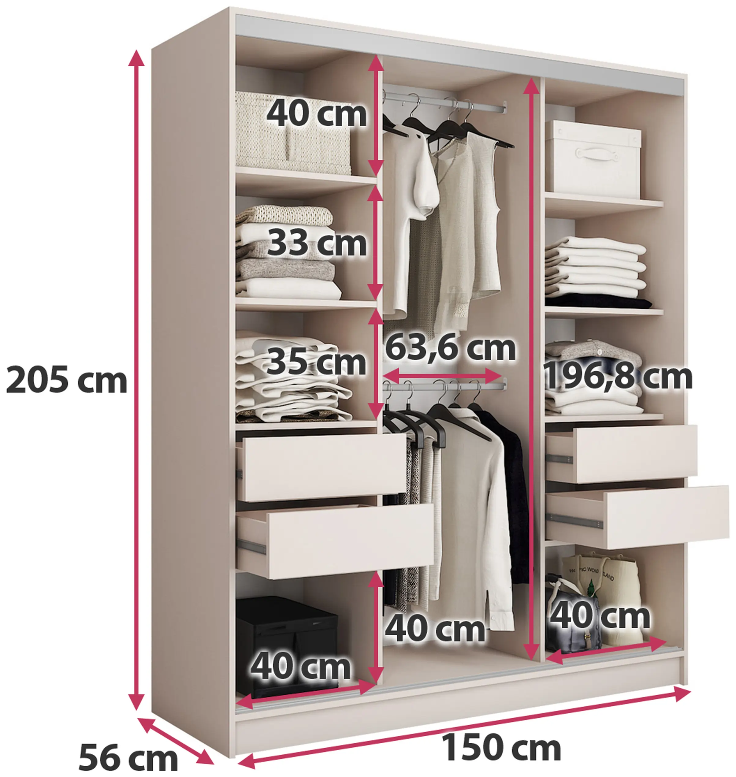 Wszystko się w niej pomieści bez problemu. Nowoczesna szafa przesuwna, prezentuje się bardzo dobrze. Łatwy i szybki montaż. Jednak wyrób z za cienkiej płyty. Przy tych gabarytach płyta 18mm spełniła by swoje zadanie. Płyta 16 mm jest stanowczo za cienka. Mimo wzmocnienia z mojej strony w narożach szafa nie jest stabilna na 100 %. Kolejna kwestia z spowalniaczami do drzwi i szuflad. Niestety ani szuflady ani drzwi nijak się mają do tych udogodnień. Dedykowane przez producenta spowalniacze drzwi nie mieszczą się , a spowalniacze szuflad nie spowalniają. Przyczyna, za ciasno chodzą prowadnice i również nijak się to ma do montażu spowalniaczy szuflady. Czyli zakup bez sensu, a miał ułatwić otwieranie i zamykanie. Reasumując, szafa w tych gabarytach warta tych pieniędzy mimo kilku niedociągnięć. Prezentuje się bardzo dobrze. Zobaczymy jak długo posłuży.